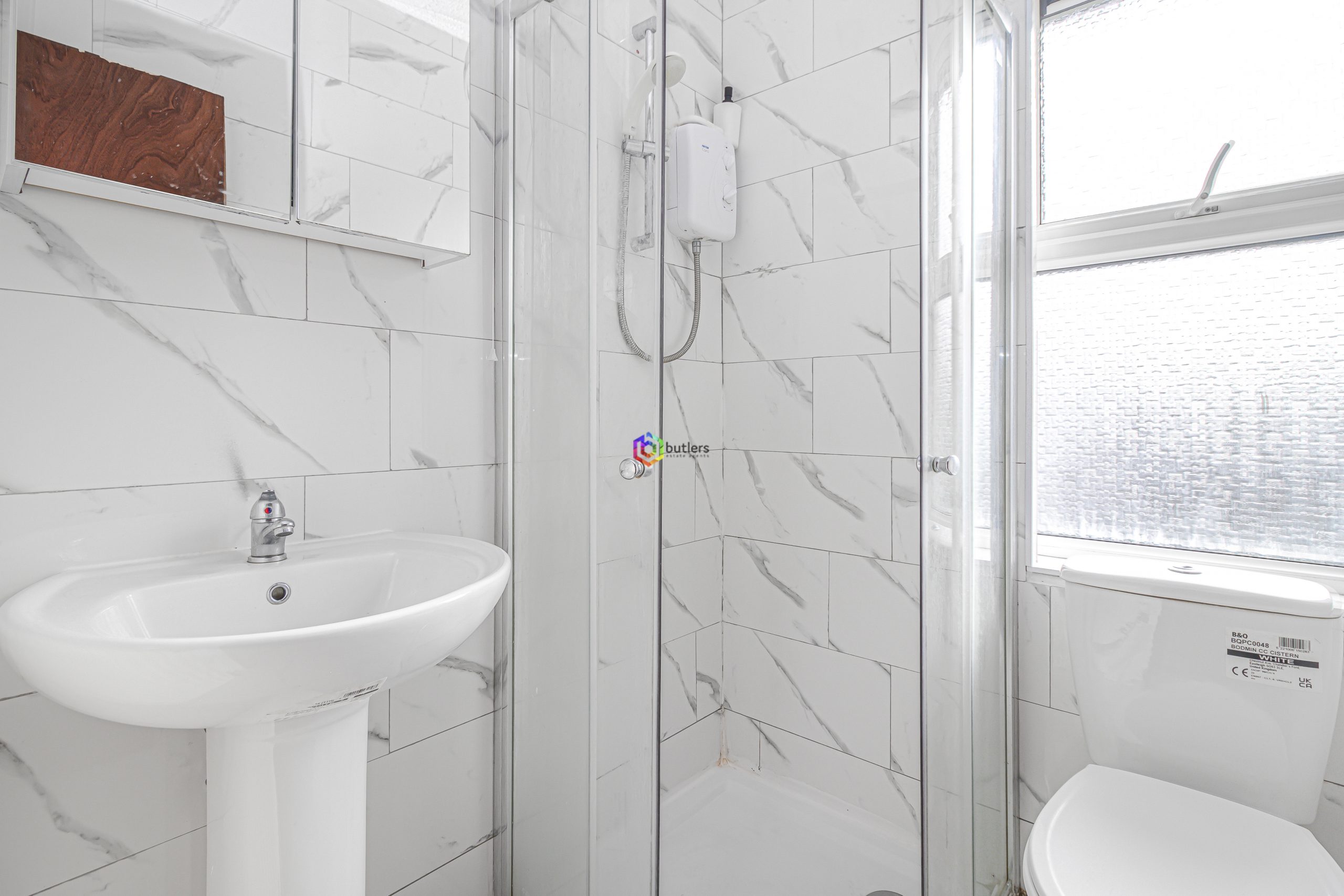 Modernised with PVC-clad walls, a corner shower cubicle, a hand-wash basin on a pedestal, and a white WC.