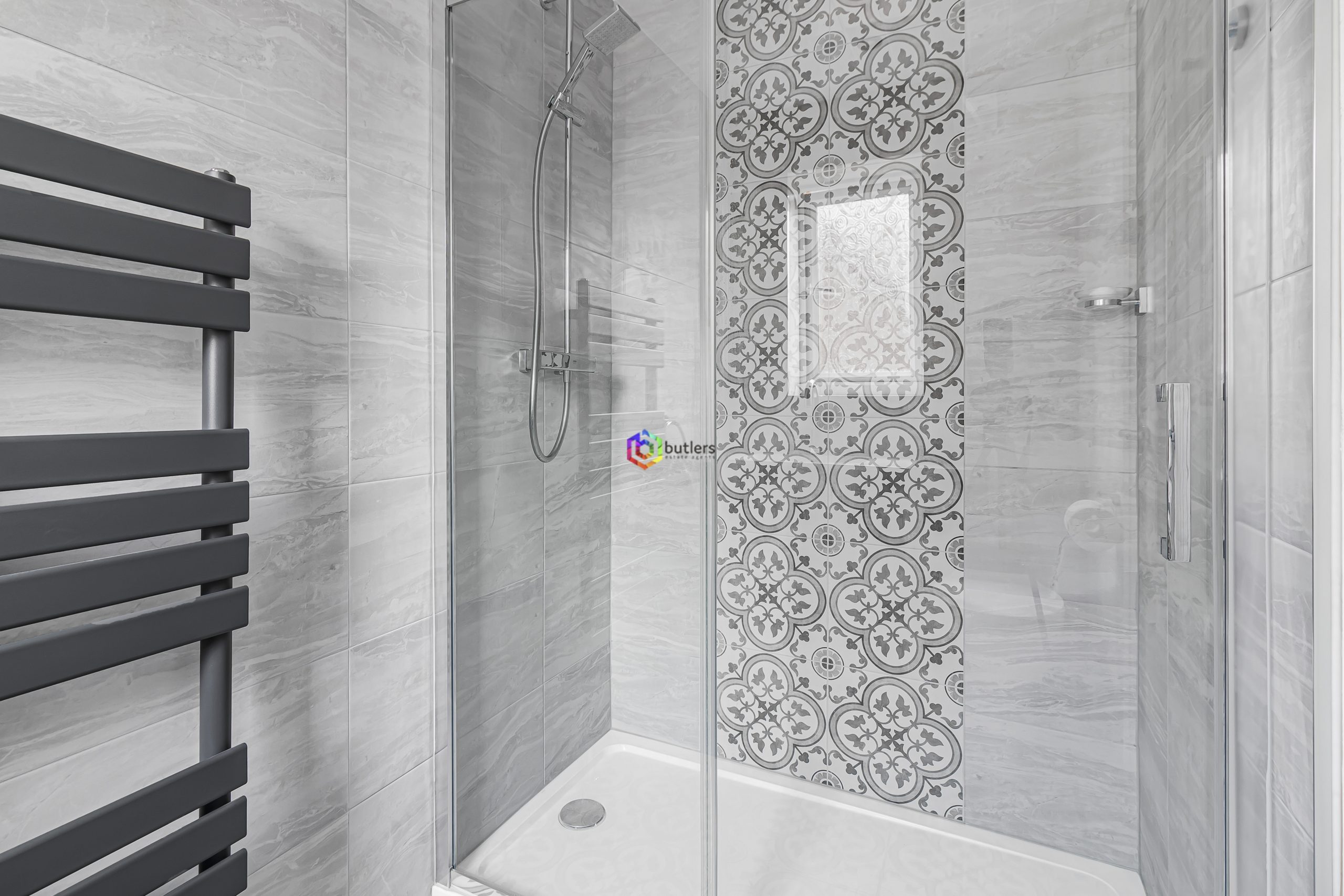Recently upgraded and redesigned to provide a full double-width shower, a white wash hand basin on a vanity unit with back to the wall style WC. There is a modern grey vertical tower radiator and a window to the side.