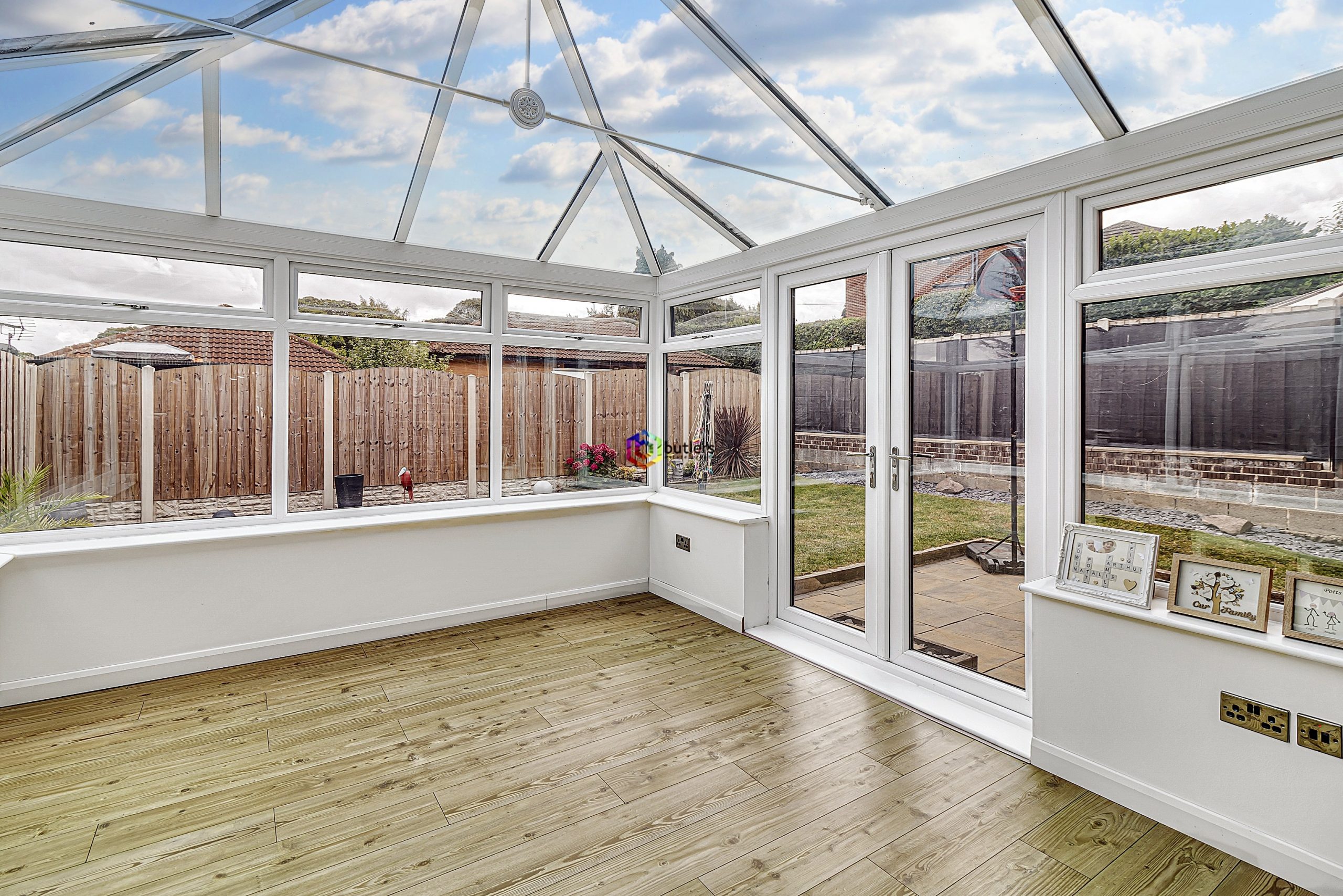 This large conservatory to the rear of the house adds more living space and is a great space to enjoy the garden when the weather isn't kind. Glazed to all three sides and the roof.