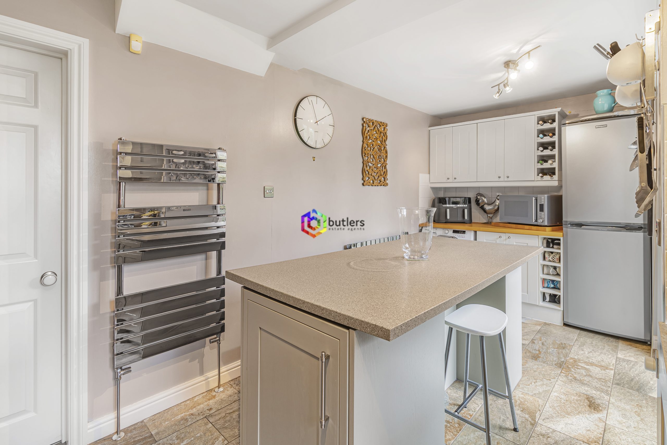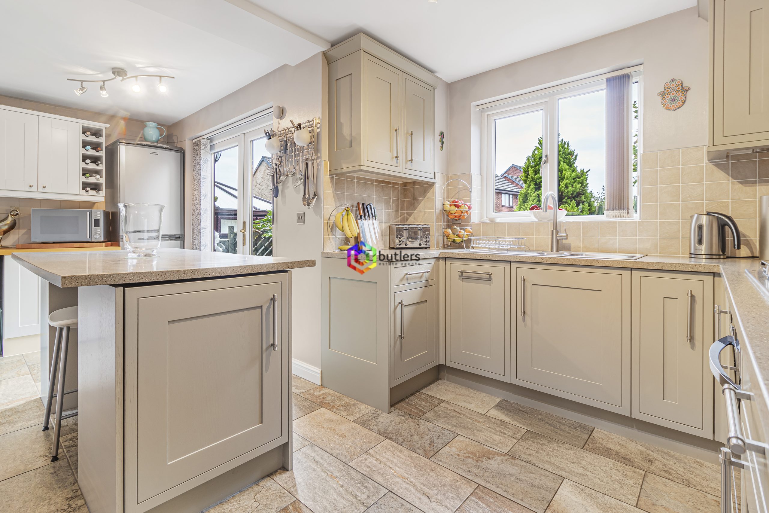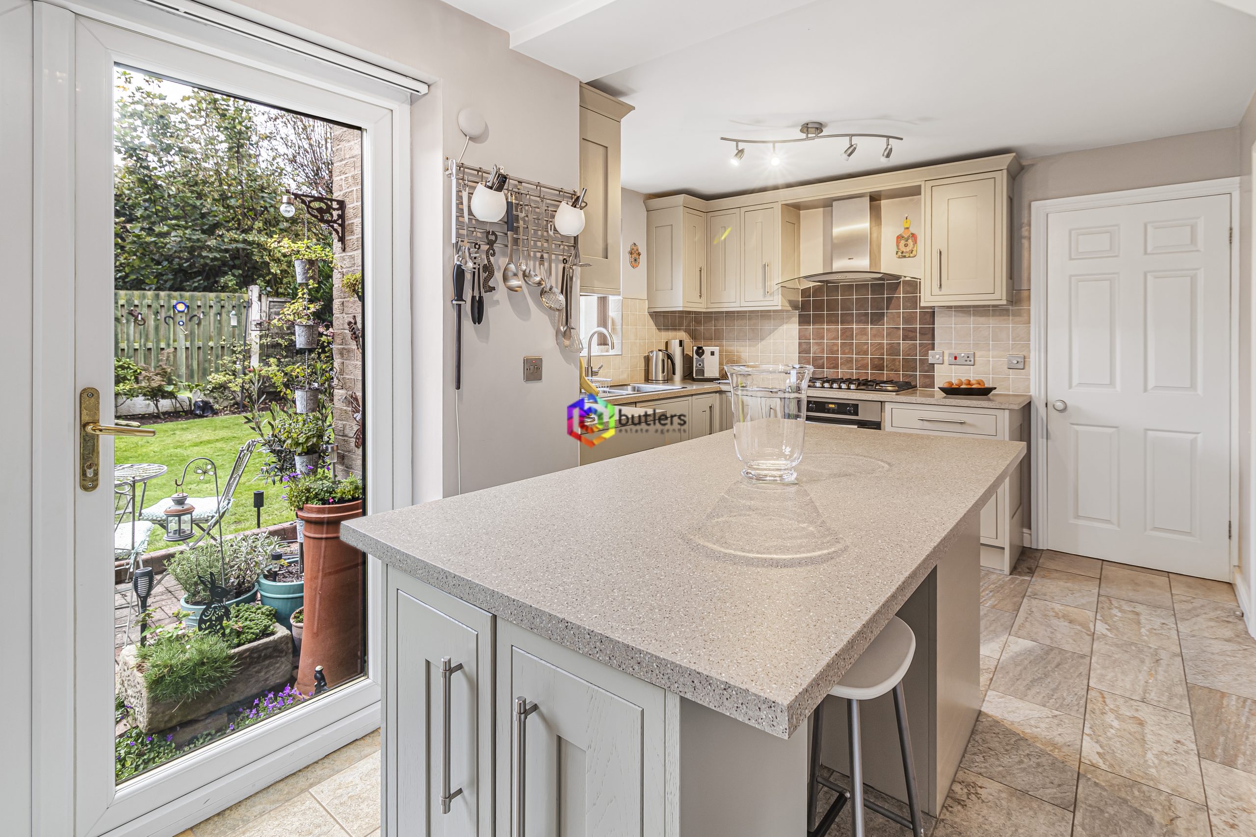 A great use of space with a range of fitted wall and floor-mounted units in a modern sage green with contrasting earth stone work surfaces. One end of the room has large patio doors leading out to the rear garden patio area, perfect for those family and friend get-togethers. A central breakfast island, complete with built-in fridge and cupboard, directs you to the main kitchen area, which has a stainless steel single electric oven, 5 burner gas hob, extractor and built in dishwasher. The sink is beneath the window overlooking the rear garden. Doors lead to the hall and the adjacent dining room.