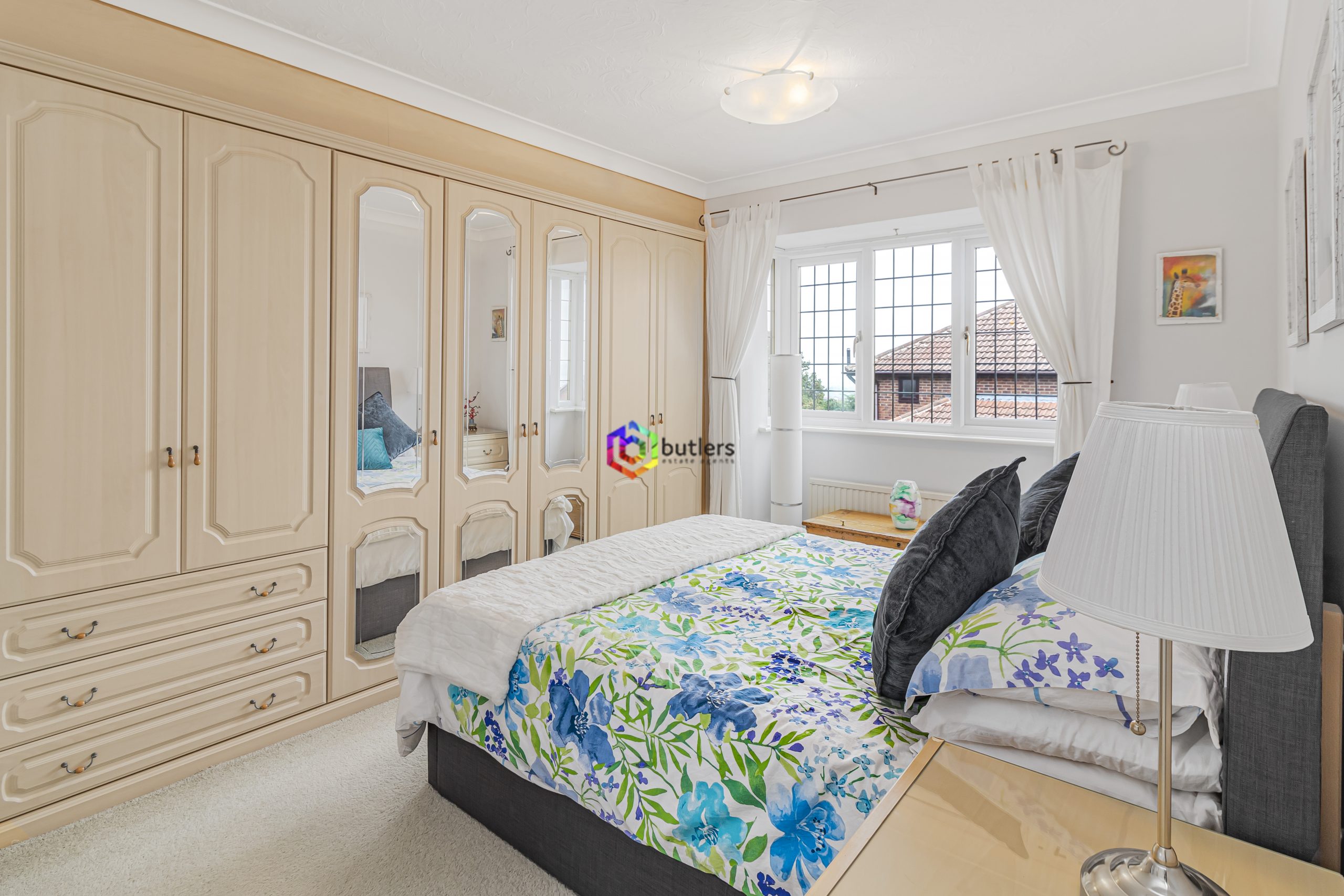 A generous bedroom located over the garage with built in wardrobes to one end of the room and a dormer window to the front.