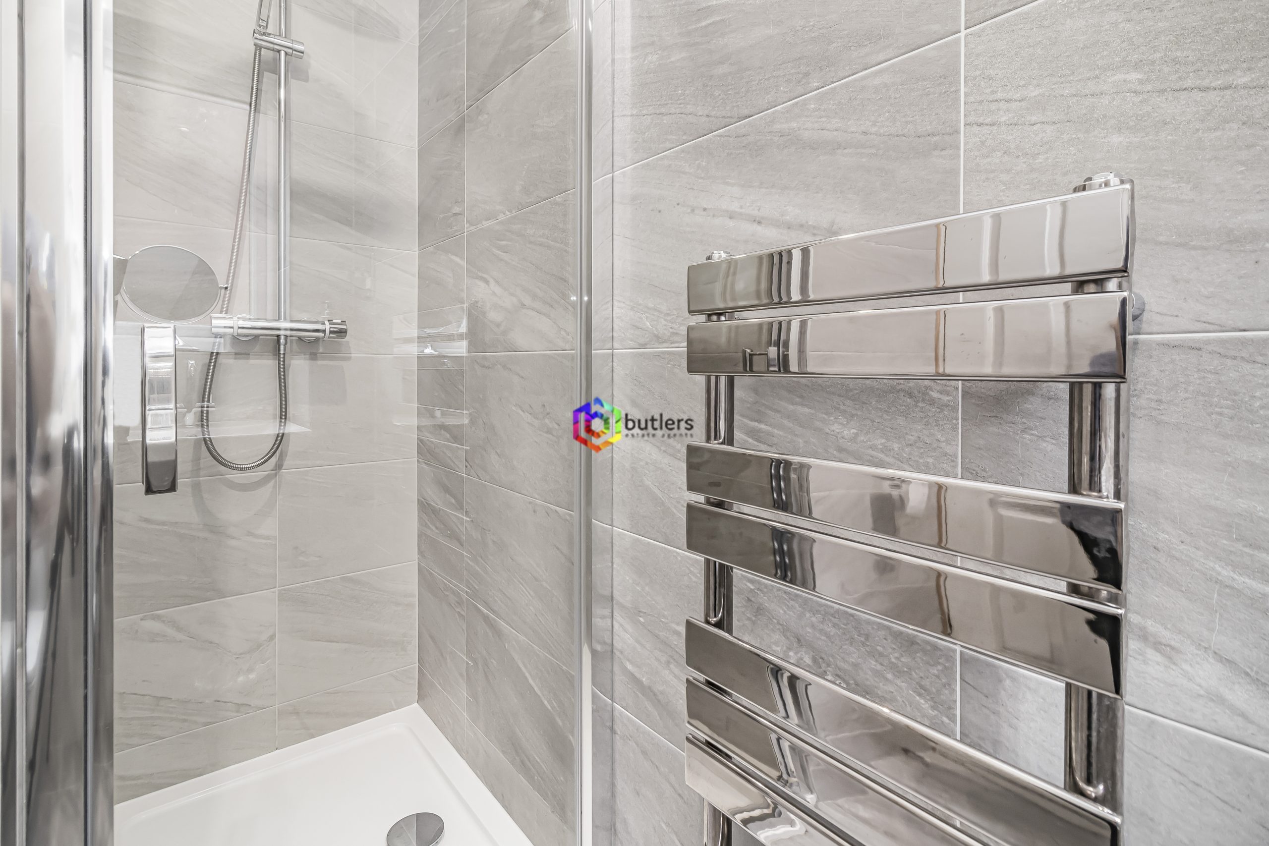 A modern shower room en-suite with a white wall-hung wash hand basin, white WC and an enclosed shower cubicle. The tiled floor has underfloor heating for that luxurious touch.