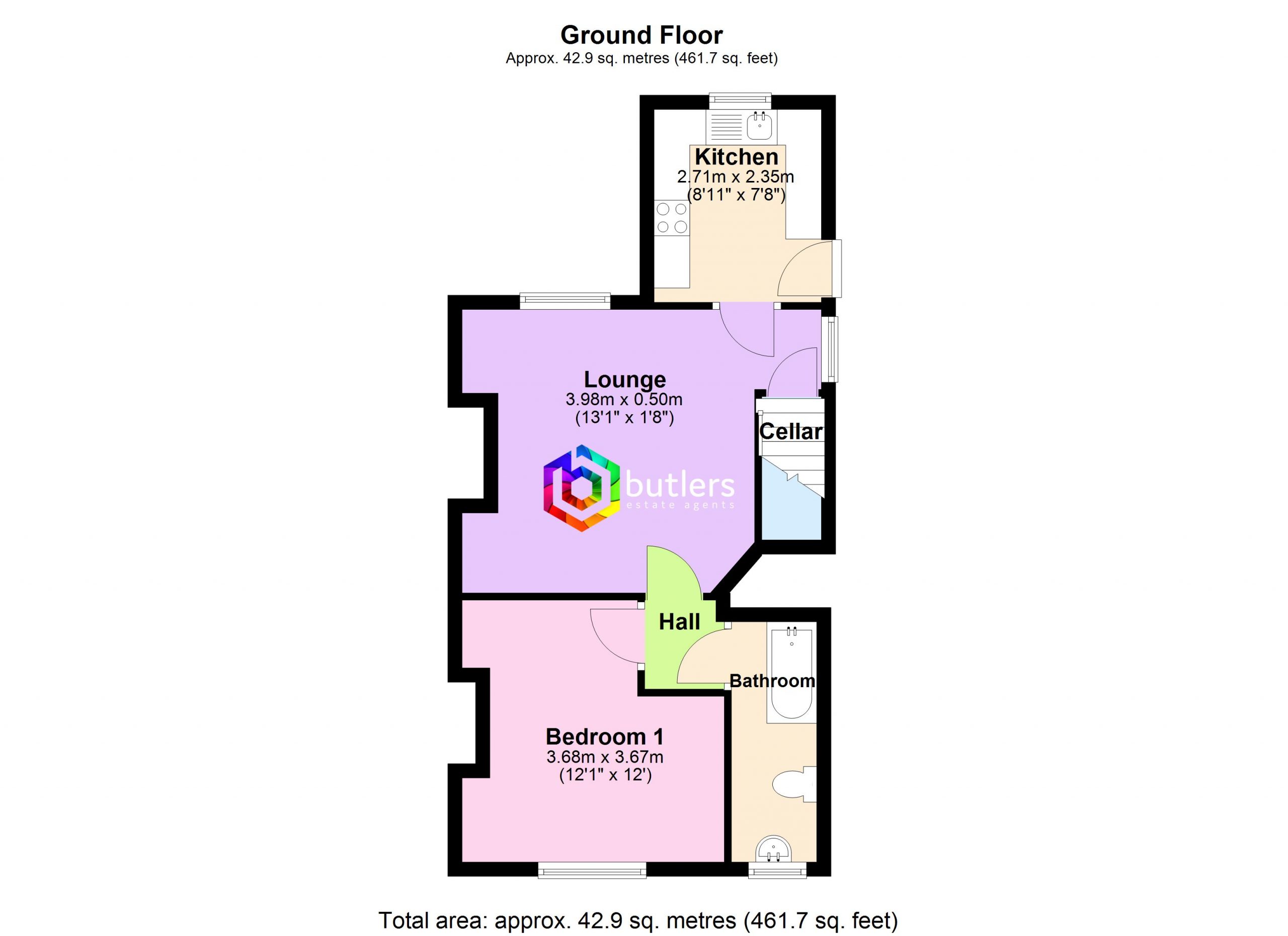 The living room offers a rear aspect with views of the garden. It is generously proportioned and includes a fireplace set within a chimney breast. A side window enhances the natural light, fostering a bright and airy ambience. The inner hallway connects to the bedroom and bathroom, with a door beneath the staircase leading to the cellar.