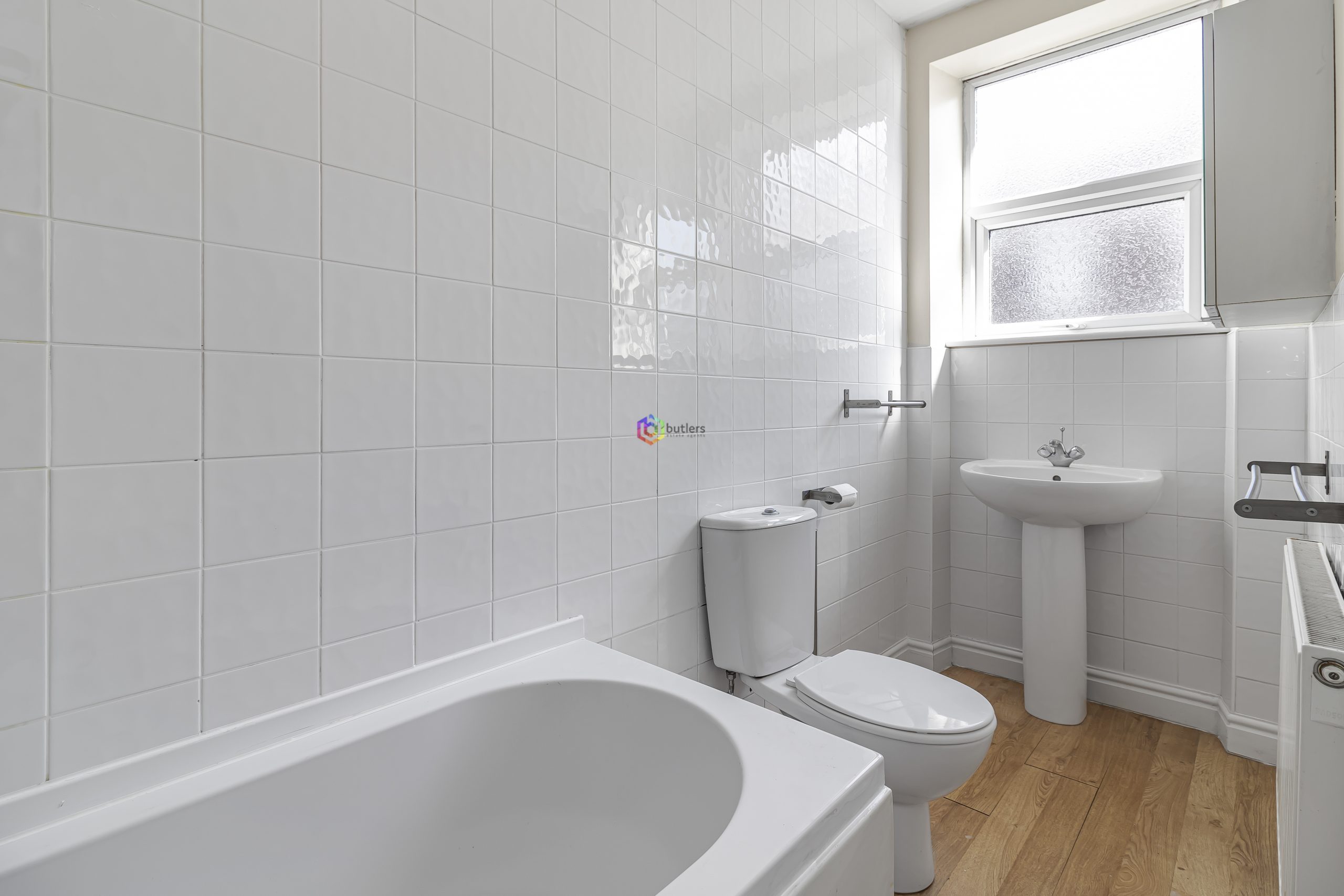 The bathroom features a front-facing obscured window and includes a low-level WC, wash hand basin, and bath.