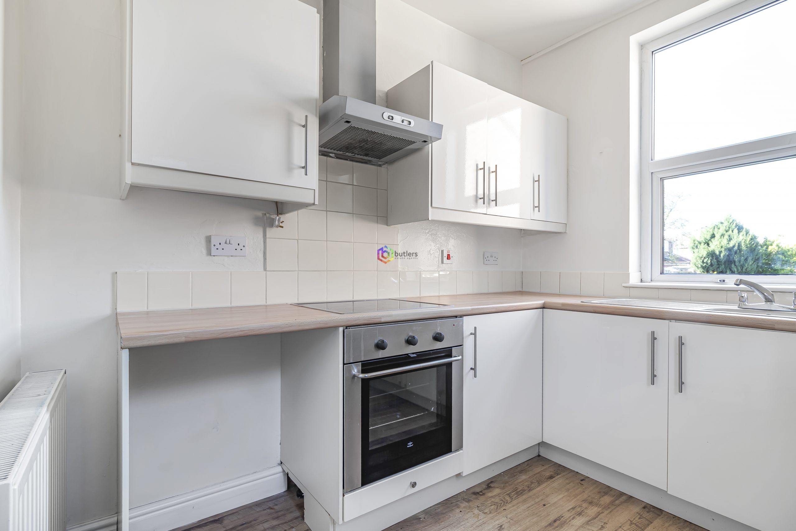 Access to the ground floor flat is granted through the side door located off the pathway. Upon entry, you will find the kitchen positioned at the rear of the property. The kitchen features a range of wall and base units containing an oven and hob. A window situated above the sink offers a rear view of the garden.