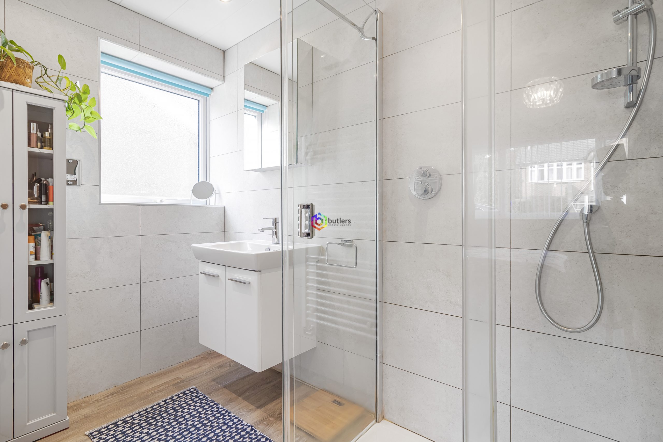 A lovely modern En-suite with a glass shower cubicle, white wall-hung wash basin on a vanity unit and a window to the side.