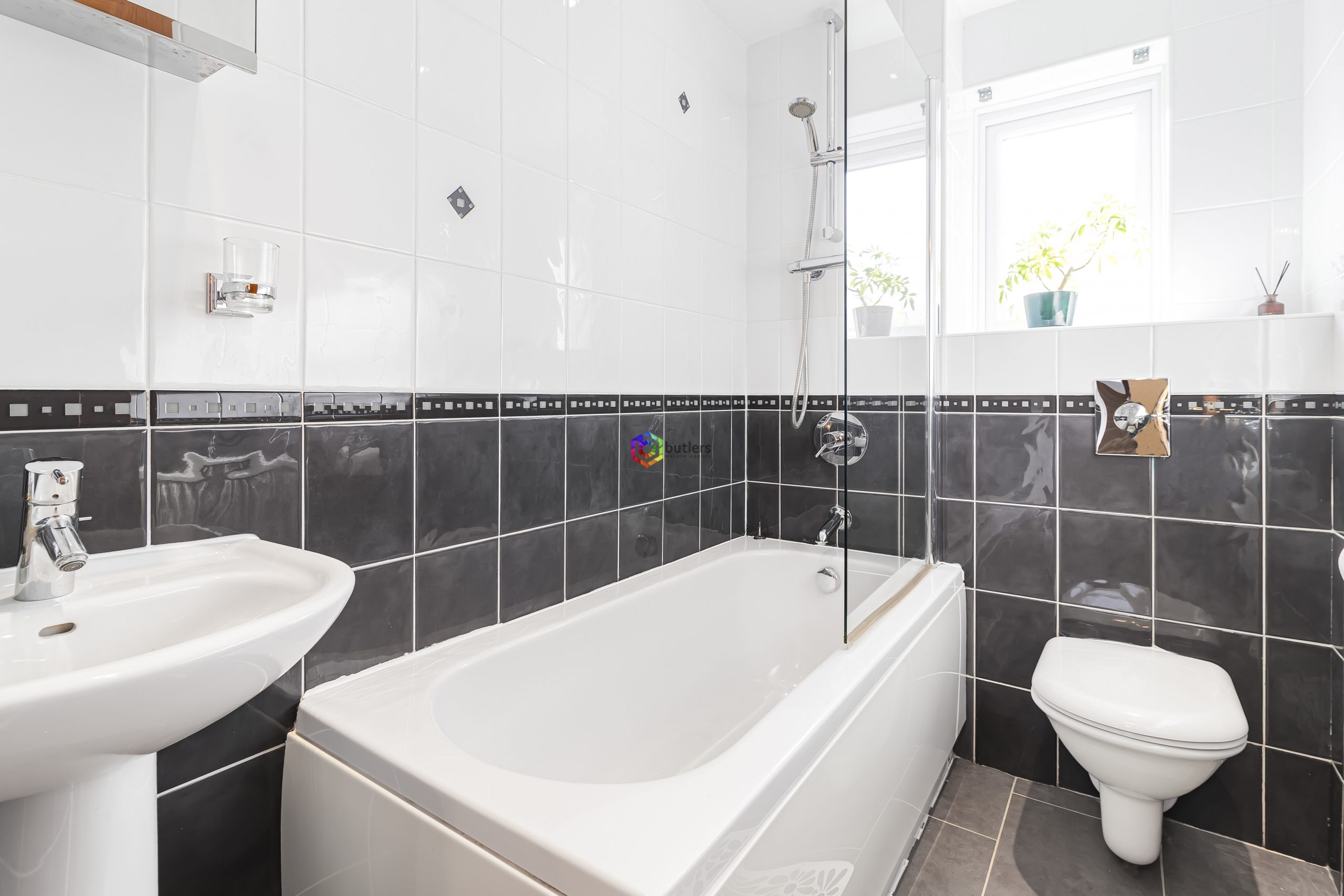 The family bathroom offers a white bath with shower over, white WC and a white wash hand basin on a pedestal.