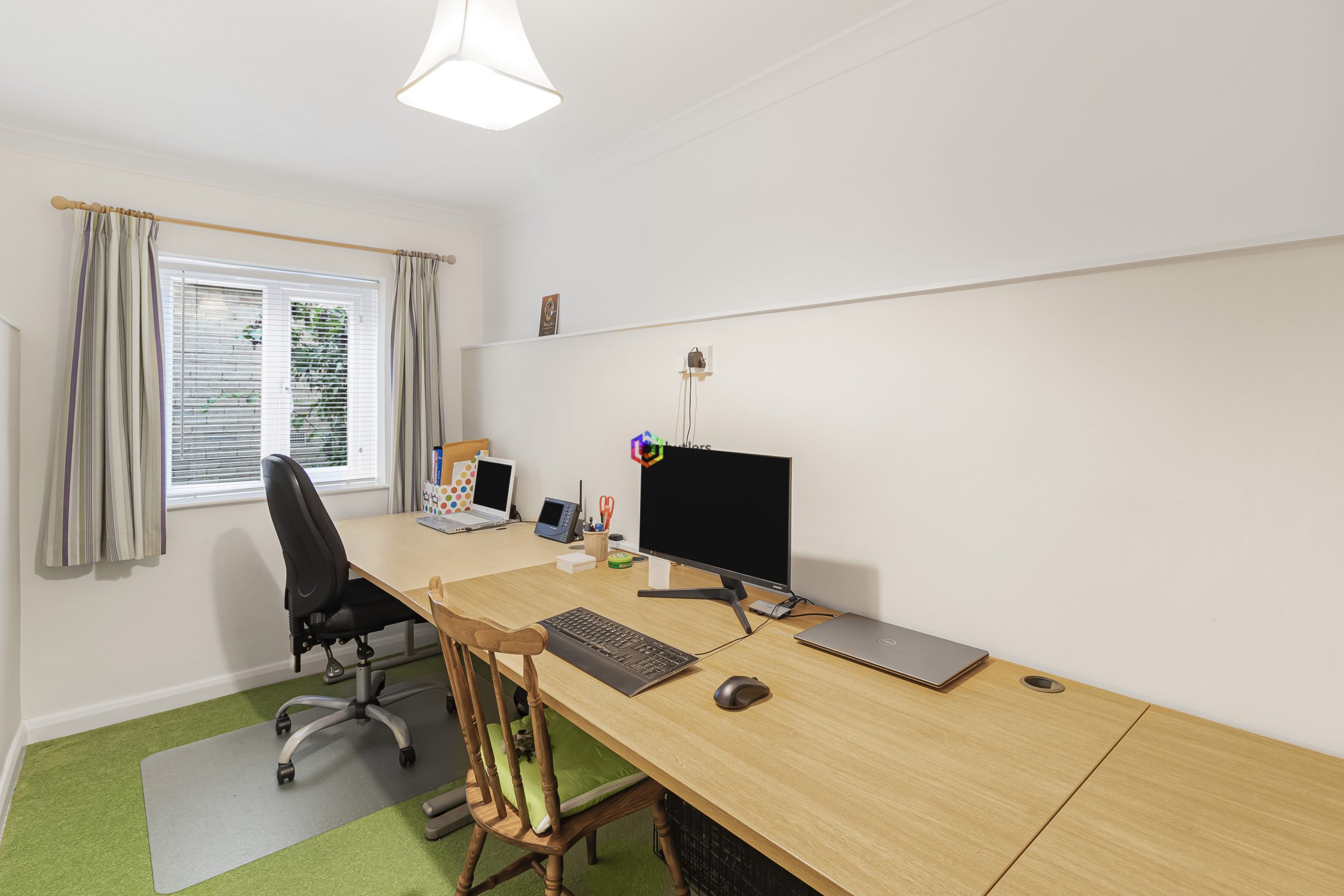 Currently set up as a work-from-home space, this bedroom offers many opportunities, especially when you look at the dimensions. There is a window to the side.