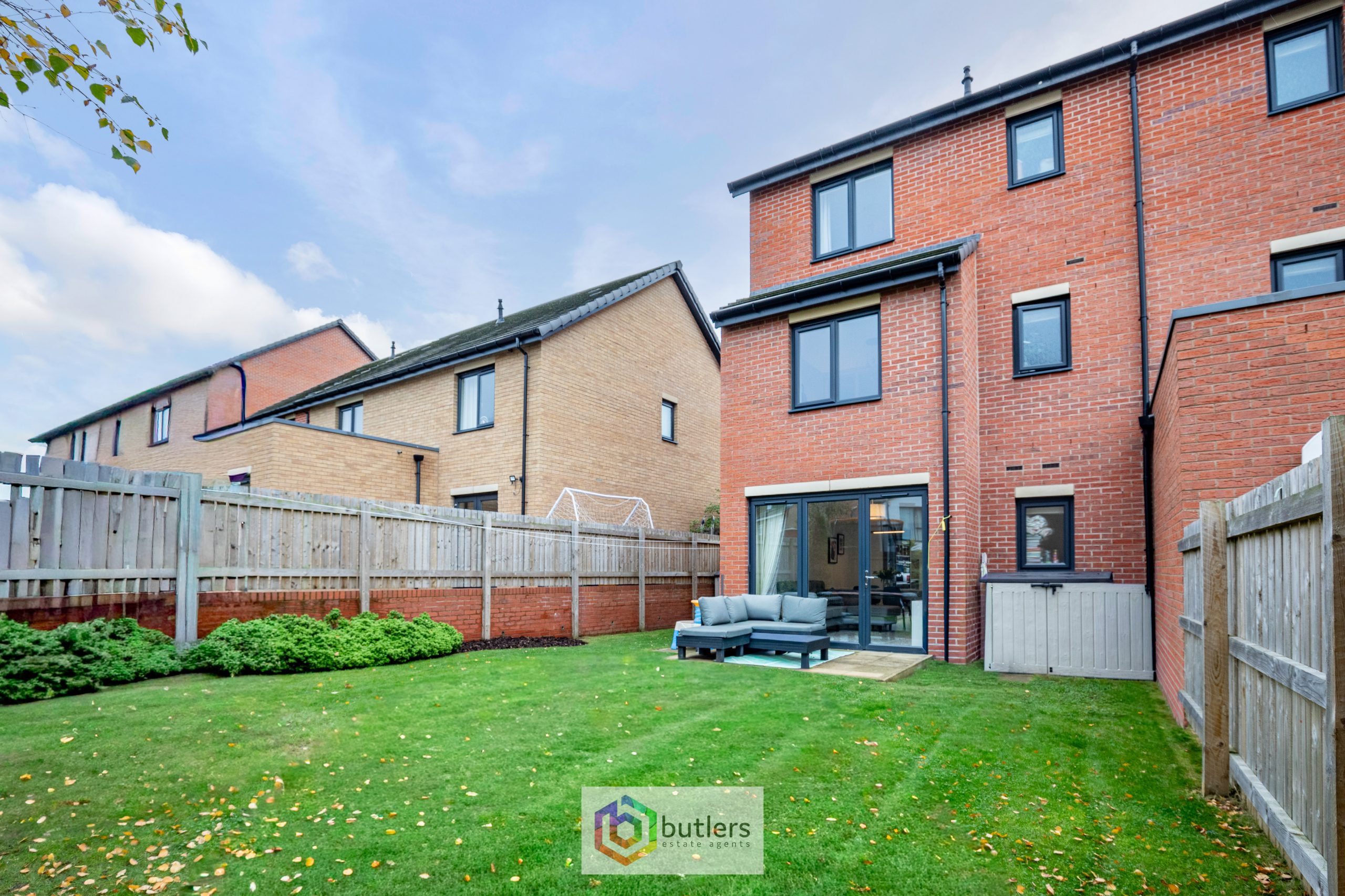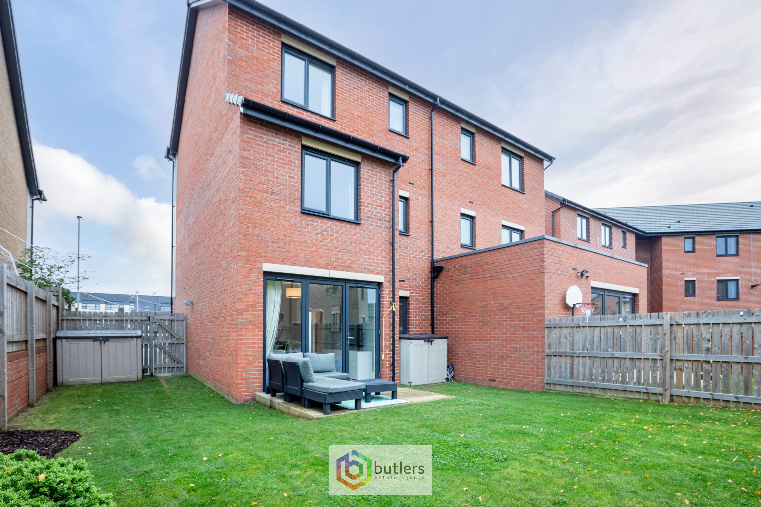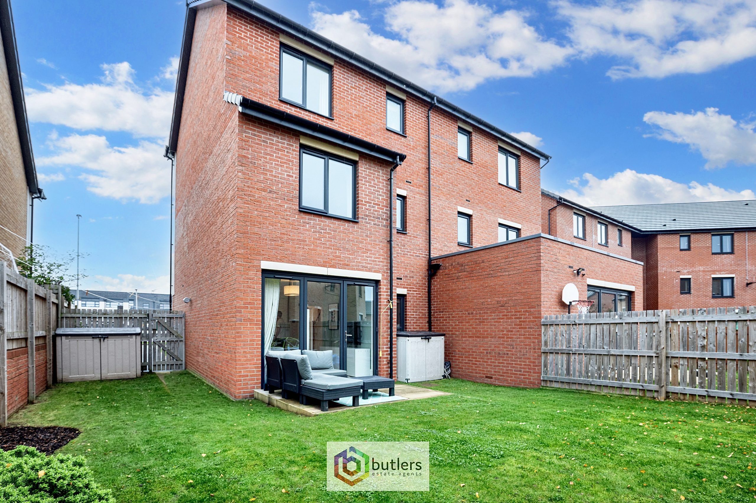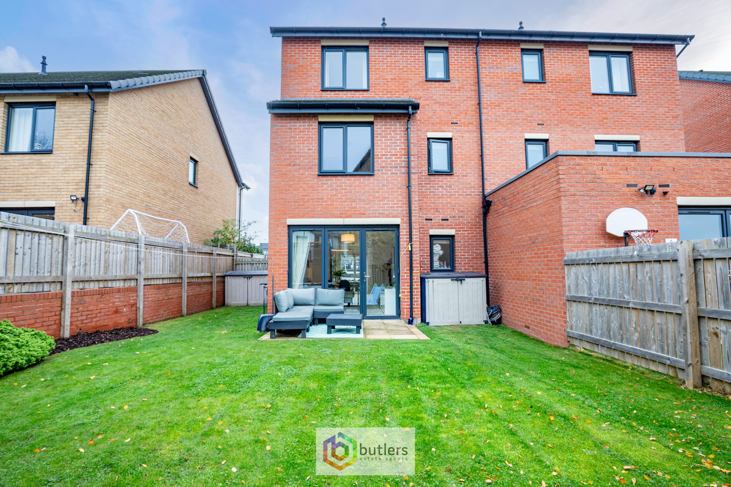 The accommodation is spread thoughtfully over three stories, providing flexibility and privacy for family life. Each bedroom is generously proportioned, with built-in wardrobes and plush carpeting, while the master suite and additional rooms offer ample natural light and modern finishes. Three contemporary bathrooms include features such as a walk-in shower, floating vanity, and heated towel rail for added luxury. Outdoors, enjoy a well-maintained private garden with a patio area and comfortable seating, perfect for summer gatherings. Off-road parking and a landscaped front garden complete this impressive home, offering style, comfort, and convenience for modern family living.