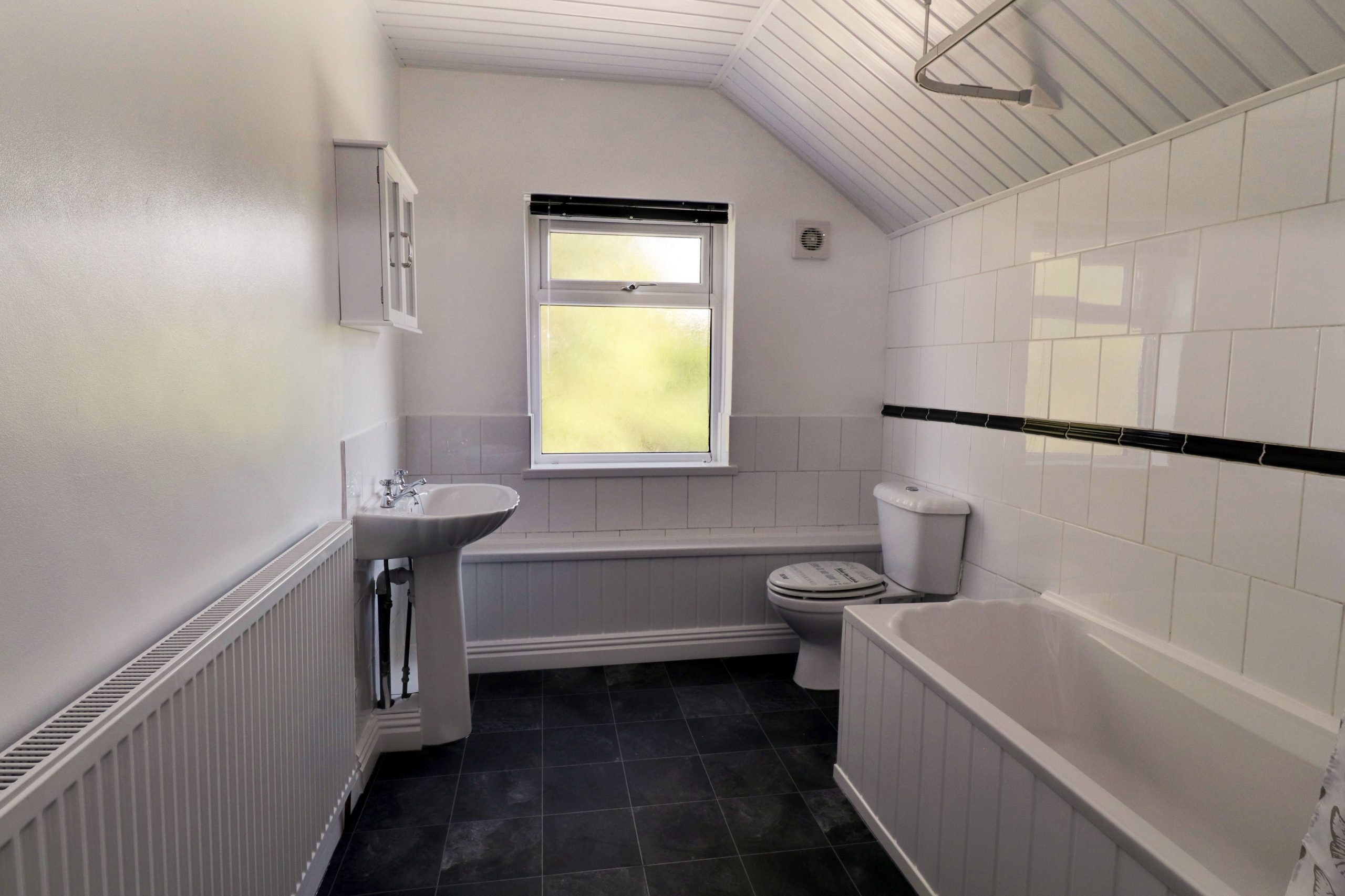 Fitted with a White bath with chrome mains fed shower over, a white wash hand basin on pedestal and a white wc. There is a UPVC window to the rear and a cupboard which houses the boiler.
