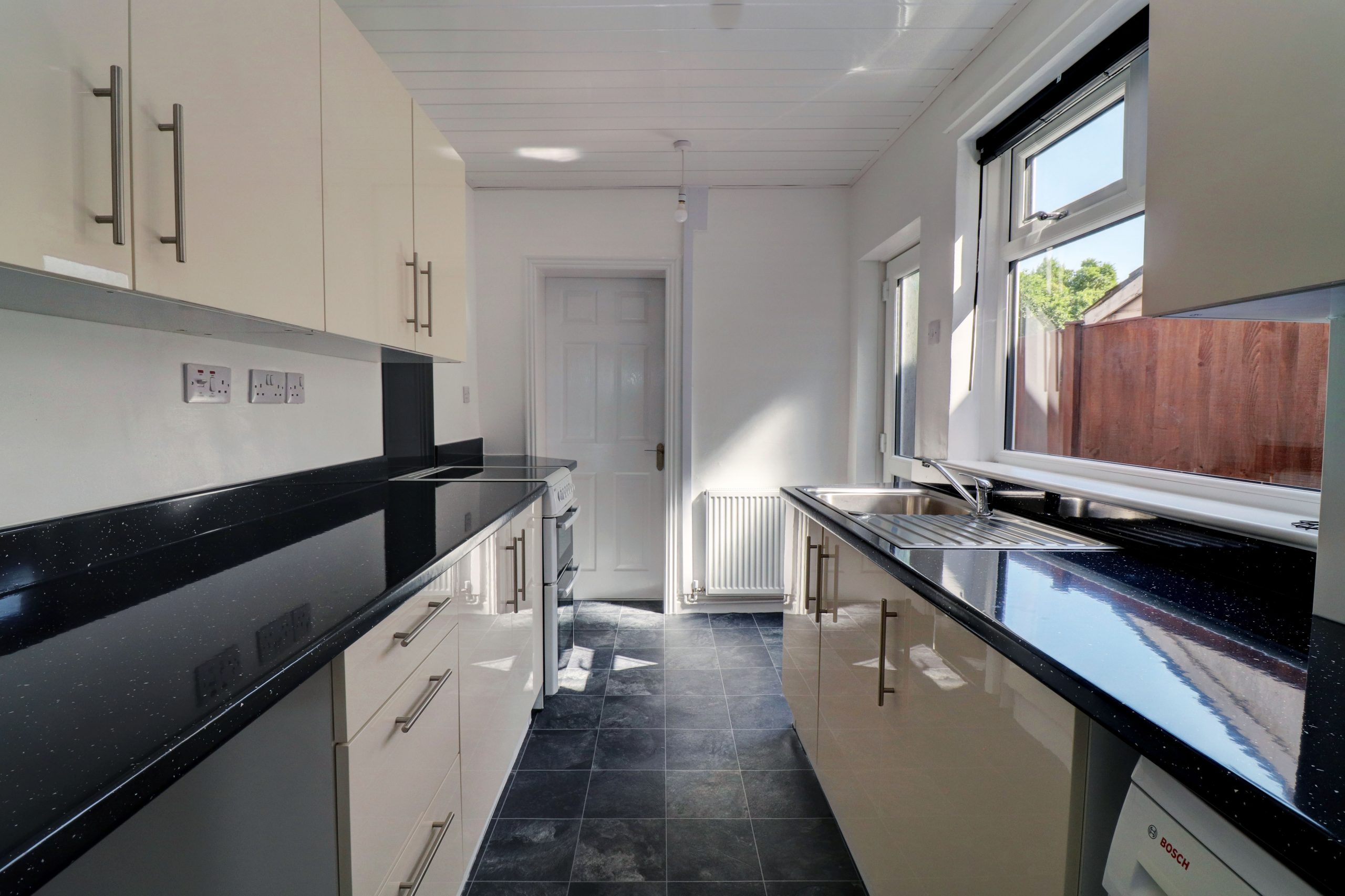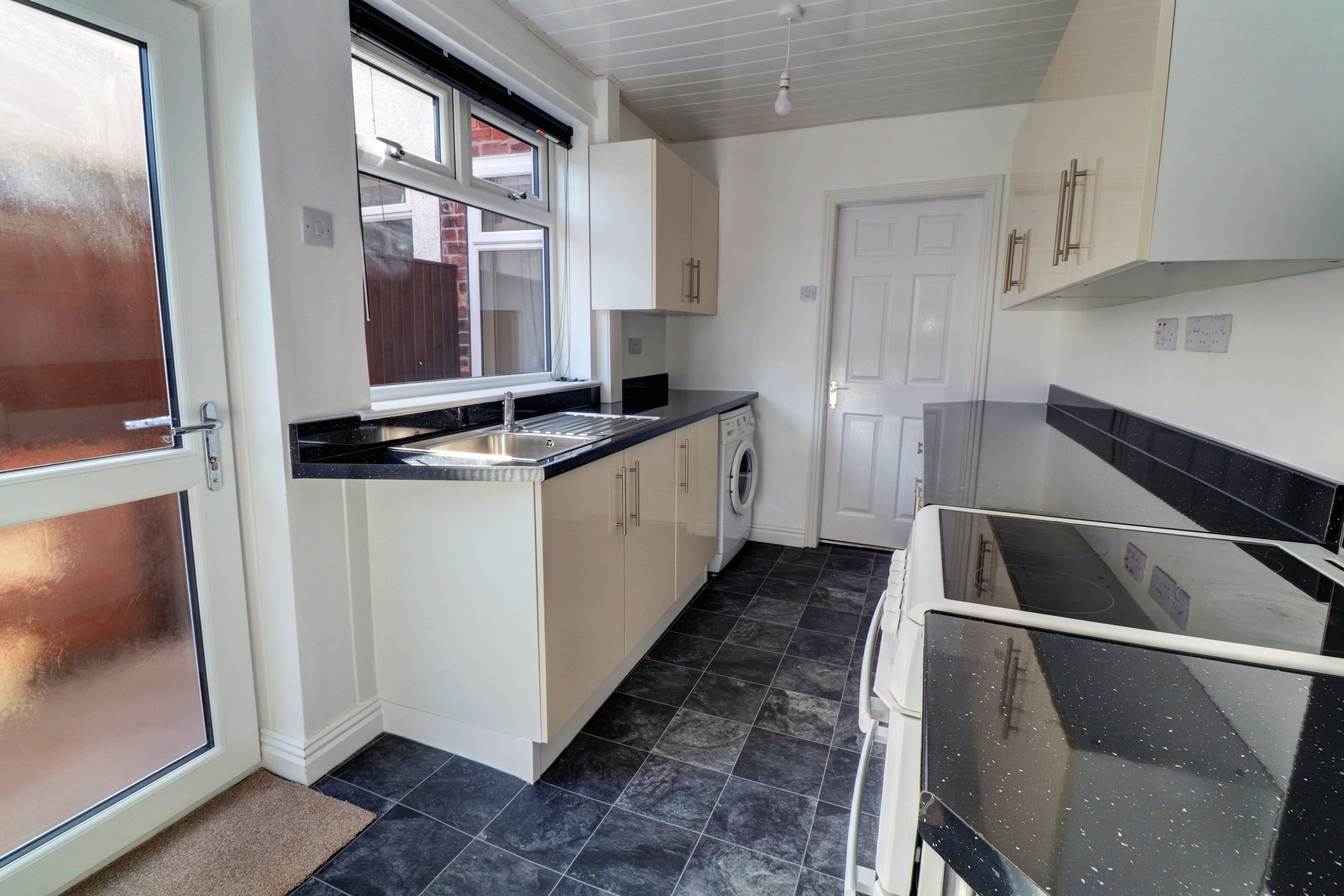 Fitted with a range of wall and floor mounted units in a cream gloss with a contrasting sparkle black worktop. There is a UPVC window to the side with a one bowl stainless steel sink and drainer below. A slot in electric cooker and a space for a washing machine.