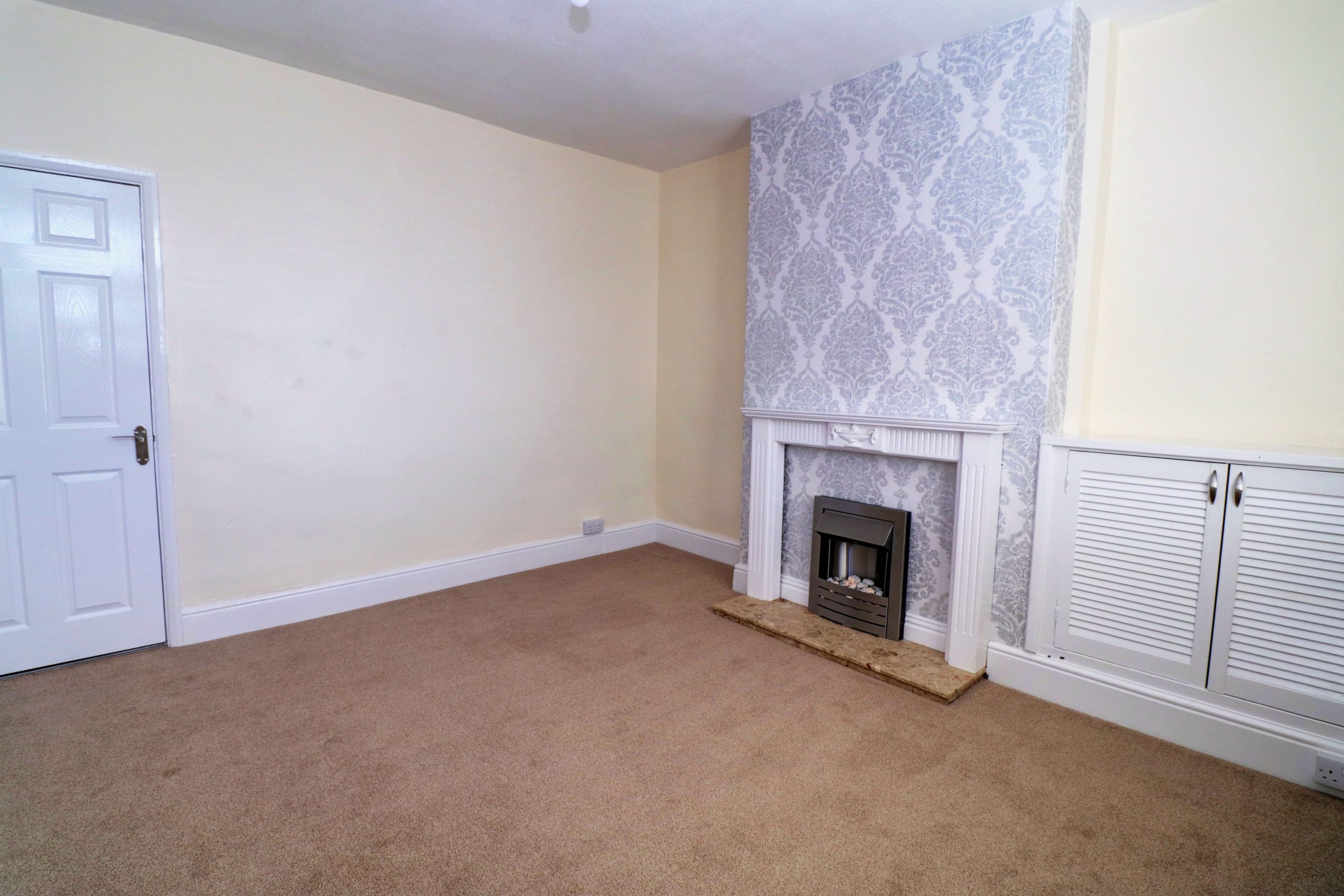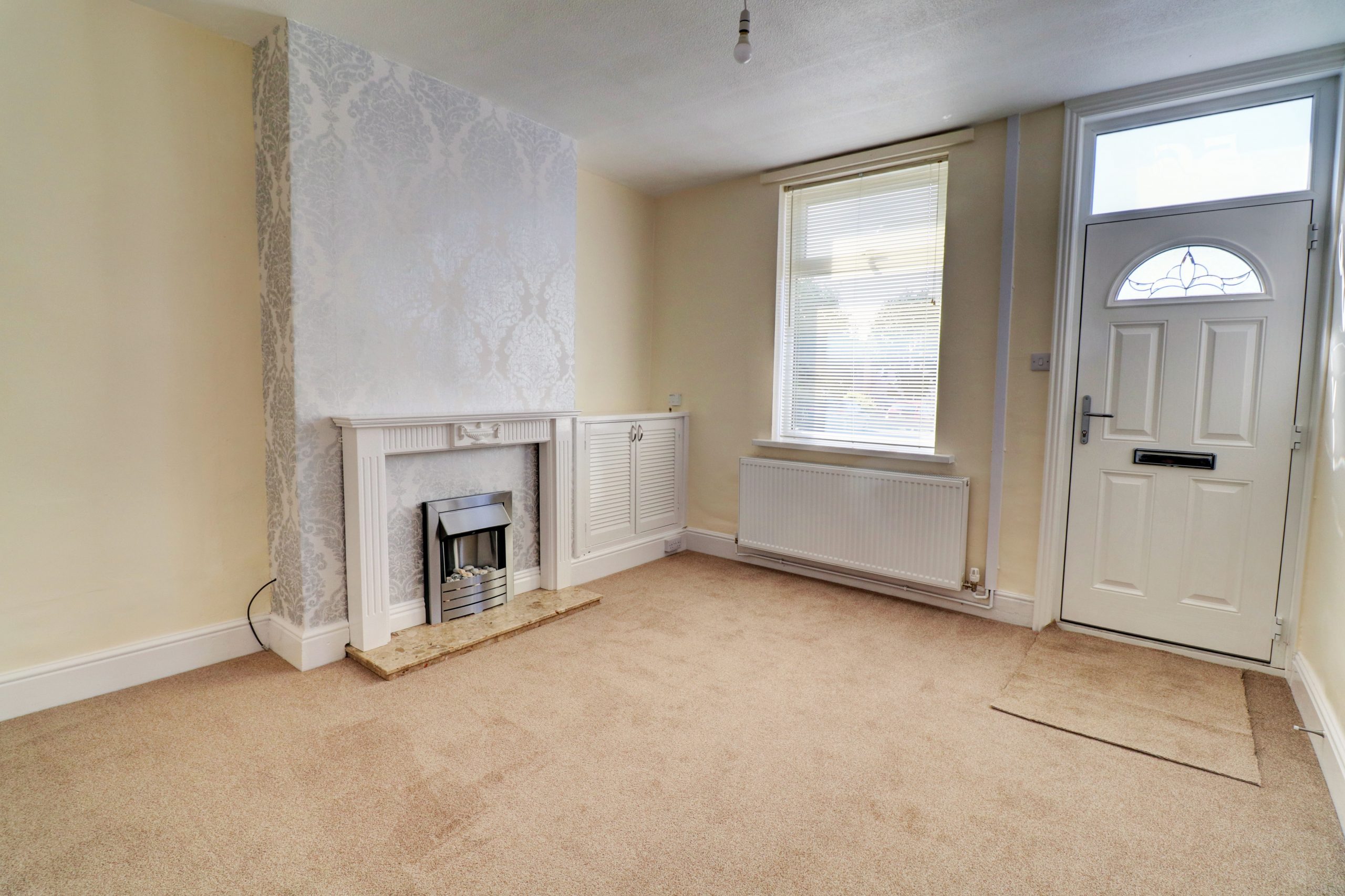 The UPVC entrance door leads you straight into the lounge. This has a fireplace with brushed aluminium electric fire, UPVC window to the front with radiator to the wall and a storage cupboard which houses the smart meters.
