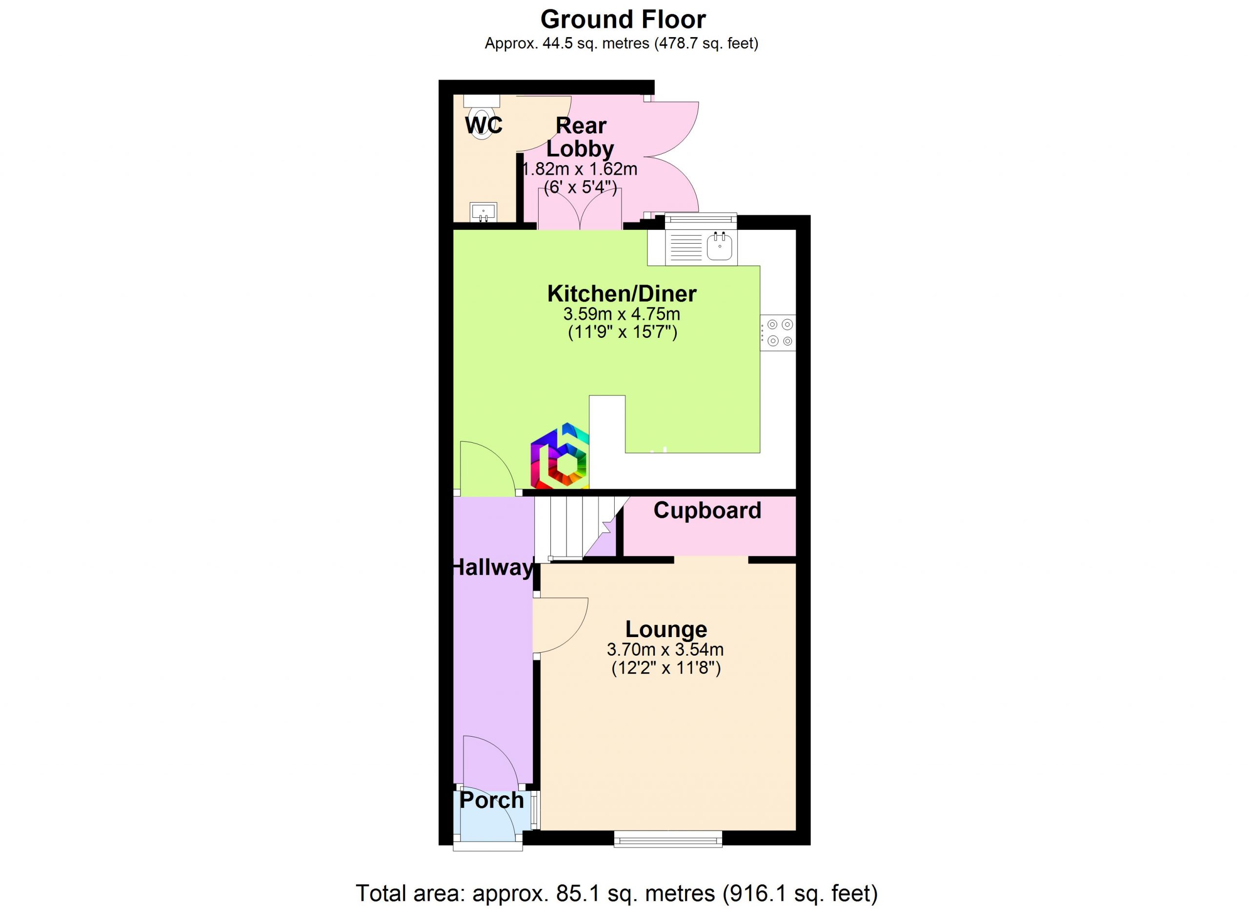 The porch door opens up to this corridor style hall providing access to the Lounge, Stairs and the Kitchen / Diner.