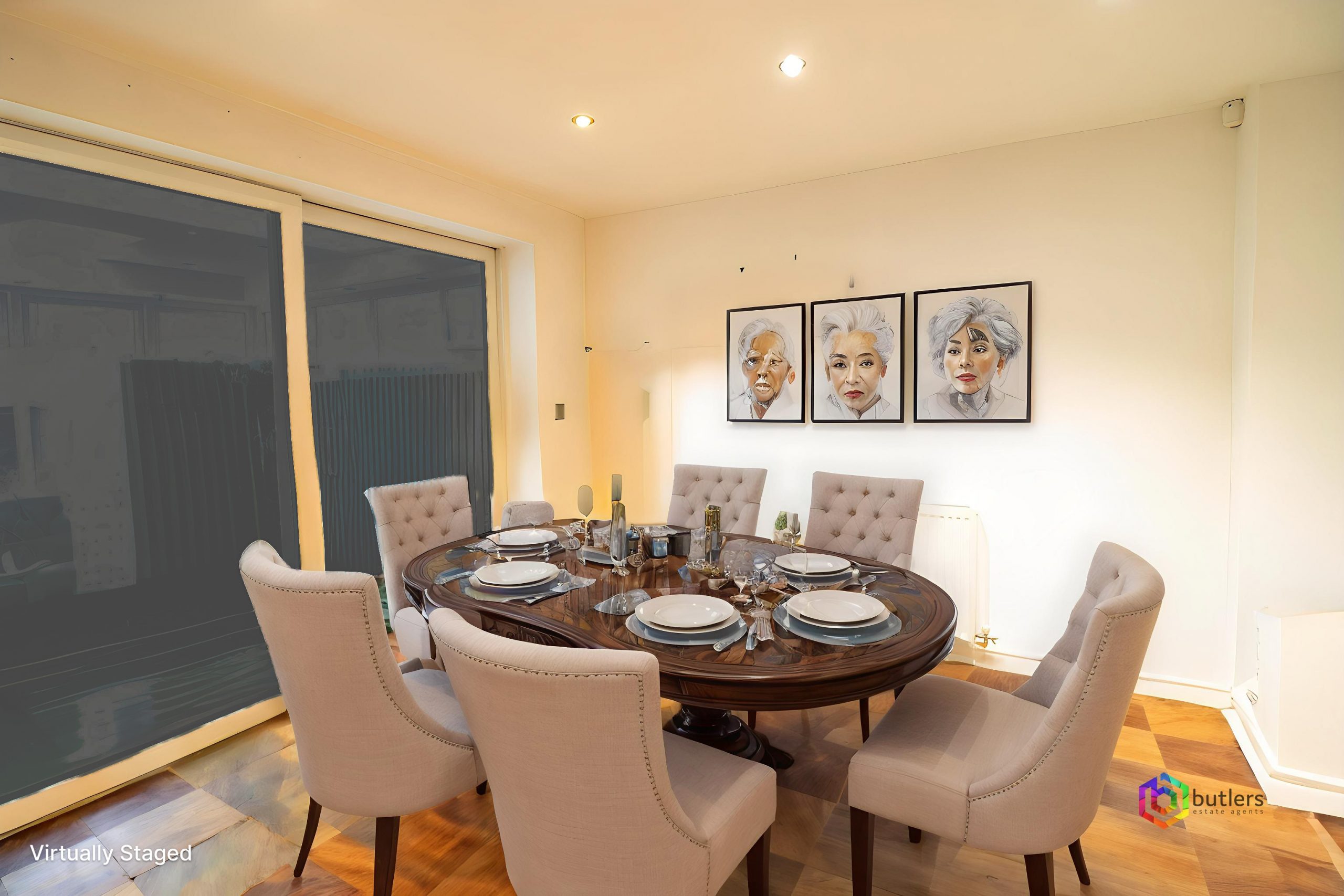 The kitchen features a range of oak effect shaker style wall and base units with complementary worktops and matching splashbacks. It is equipped with a built-in electric oven, a gas hob, and an integrated dishwasher. There is space for both a washing machine and a fridge/freezer. Positioned at the rear of the property, the kitchen has a sink with mixer tap set below the window. There is ample room to accommodate a dining table, making it ideal for family gatherings. The kitchen also provides access to the conservatory. The photo has been enhanced with virtual staging to provide clients with ideas on how the property could look, but please be aware that when viewing it will look different to the photos as this furniture will not be present.