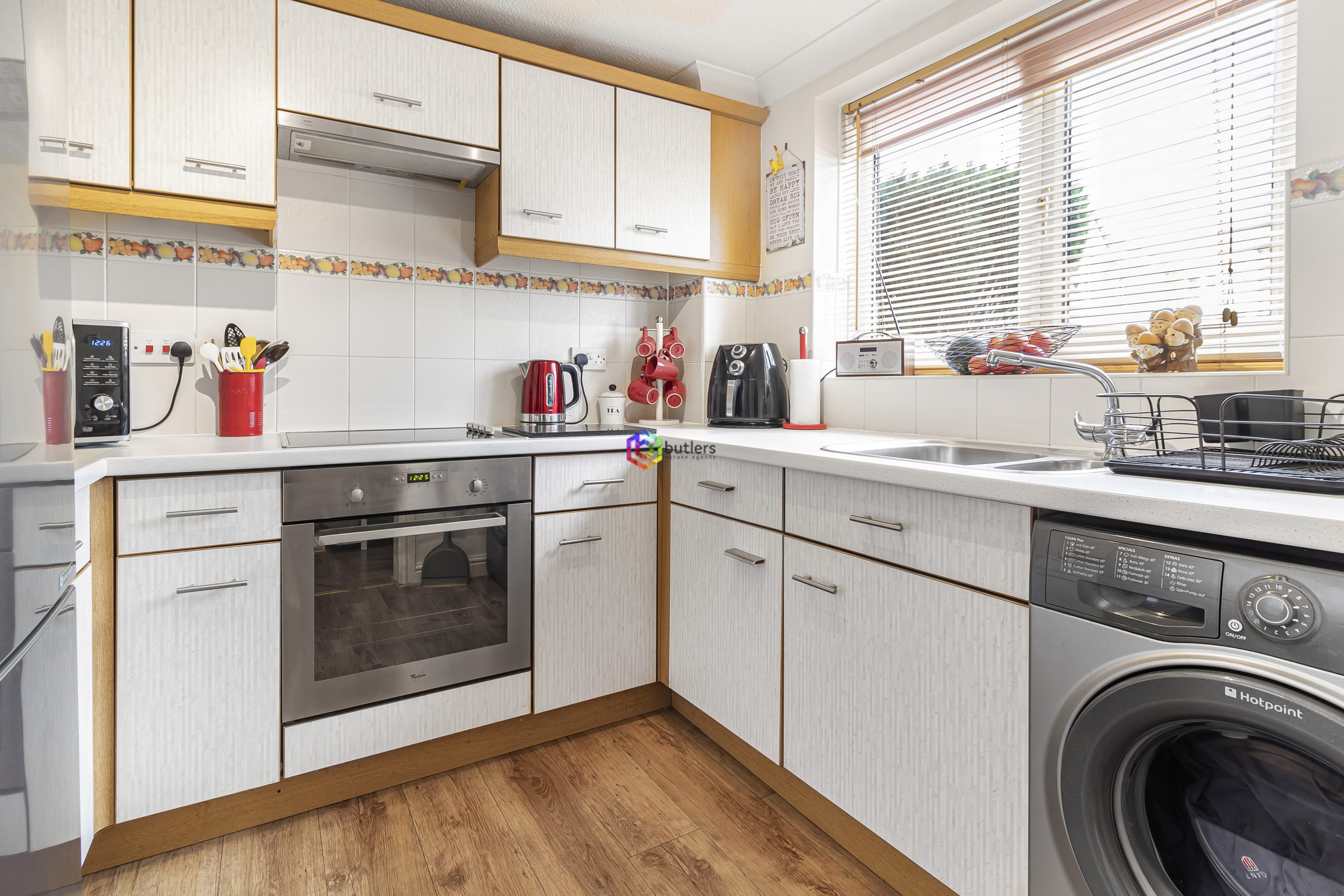 Fitted with a range of wall and floor mounted units in a white design with beech edges. A single stainless steel electric oven , hob and extractor draw you into the room and they are complimented by a fully integrated slimline dishwasher. There are spaces for the fridge freezer and washing machine.