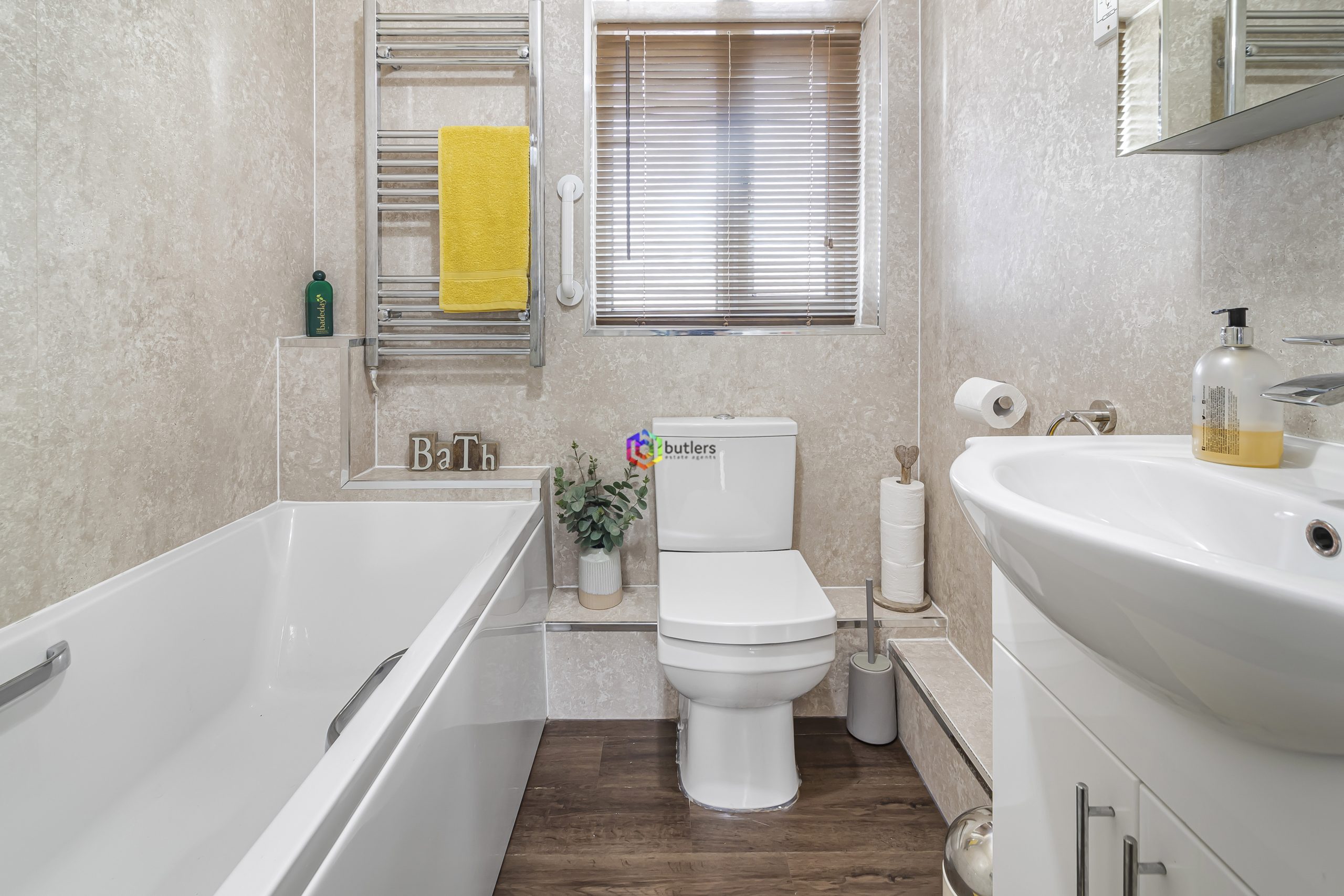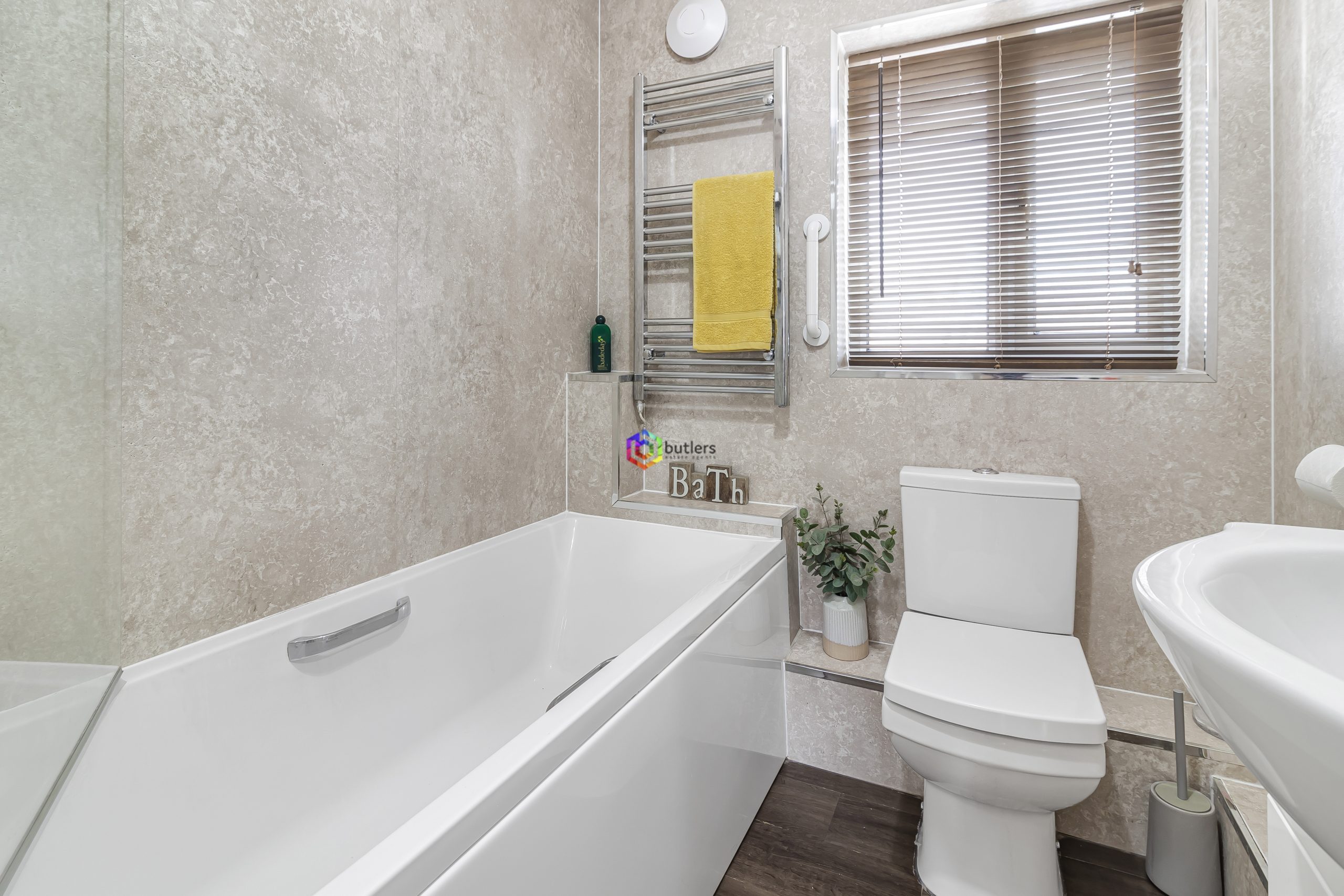 Modernised with PVC wall panels and a white suite comprising; bath with shower over and glass screen , white WC and a white wash hand basin in a vanity unit. There is a cupboard housing the upgraded hot water cylinder.