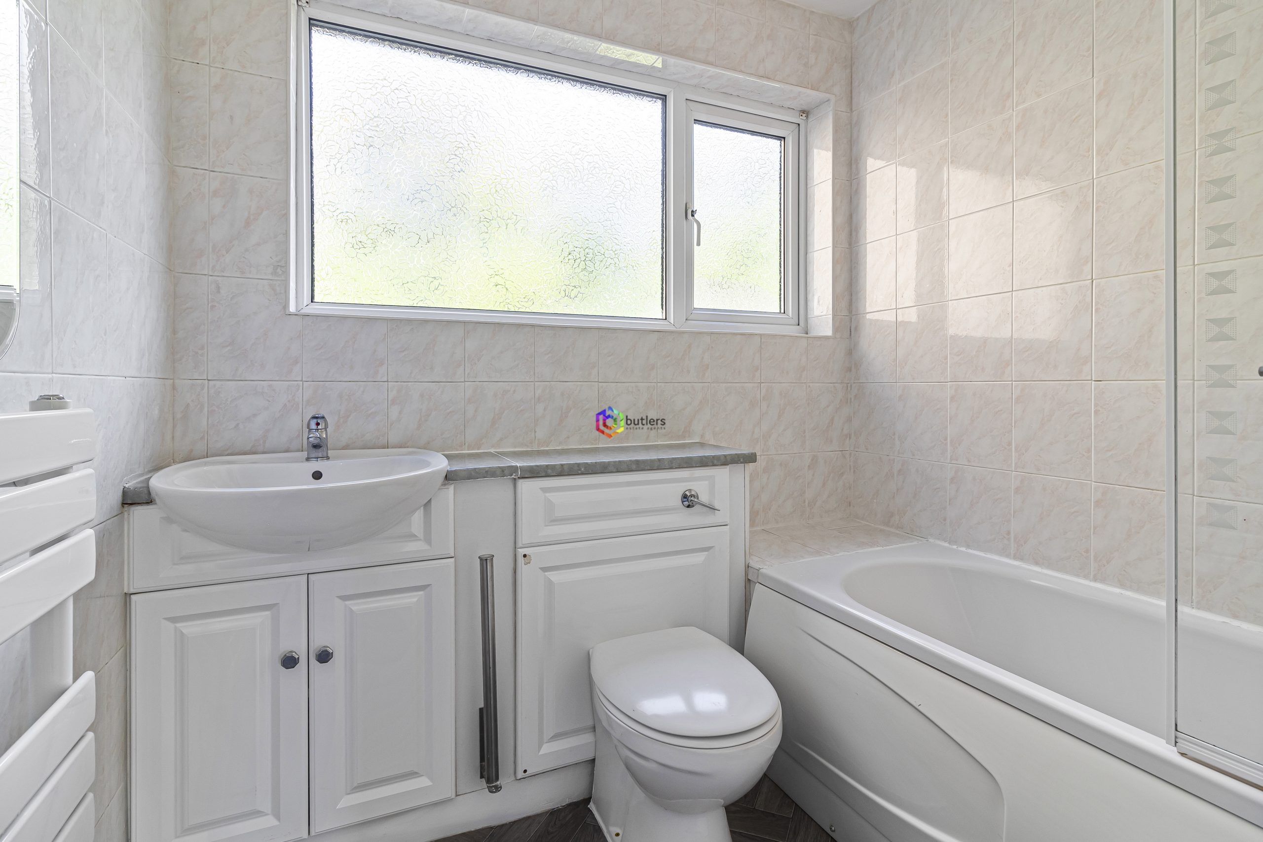 Fitted with a white bath with shower over then a vanity unit housing the white wash hand basin and white WC. There is a window to the rear