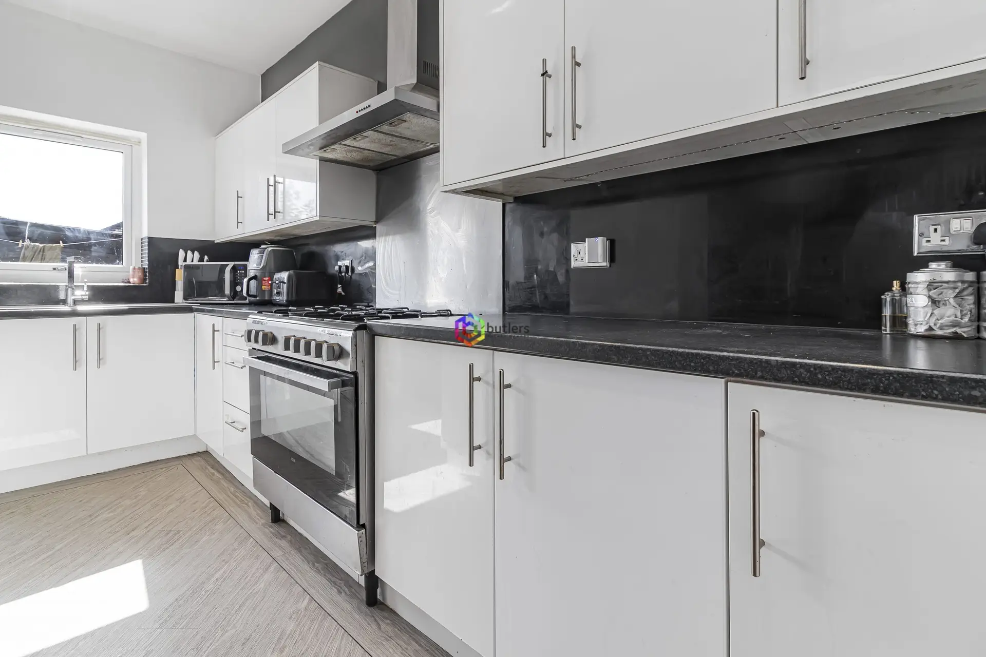 The kitchen is fitted with a range of white units with contrasting black worktops. There is a range cooker with an extractor above, at this point the kitchen opens up towards the rear of the house and has a window overlooking the rear garden and the back door. Open plan flowing seamlessly to the rest of the home, allowing for chefs to be involved in the conversation.