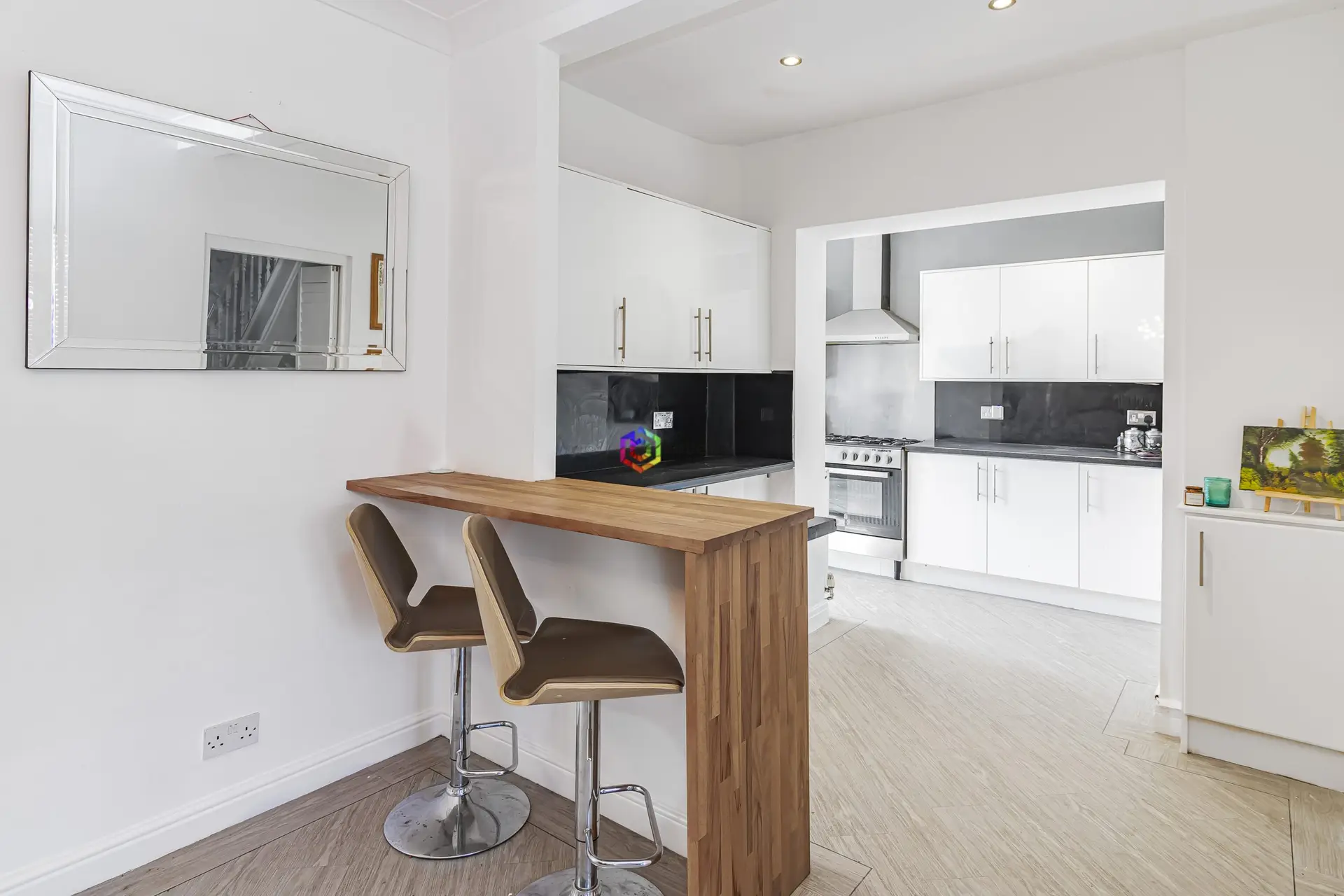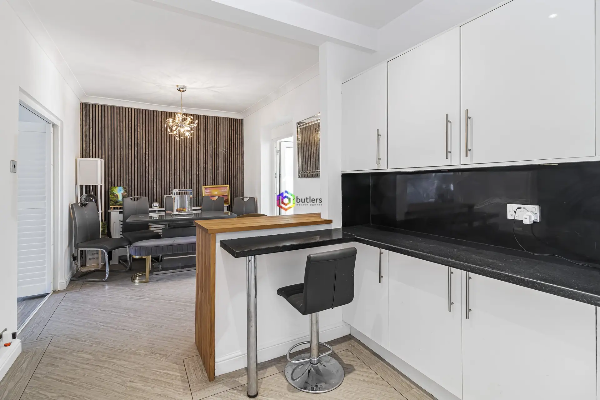 The Breakfast area is the space between the kitchen area and the Dining Area with a fitted breakfast bar and white units with contrasting black work surface. Open plan Dining/ Kitchen / Breakfast areas.