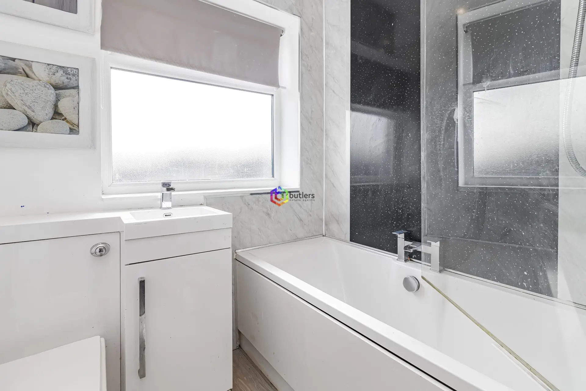Fitted with a white bath with shower over and glass screen, then a white wash hand basin and WC set into a vanity unit.