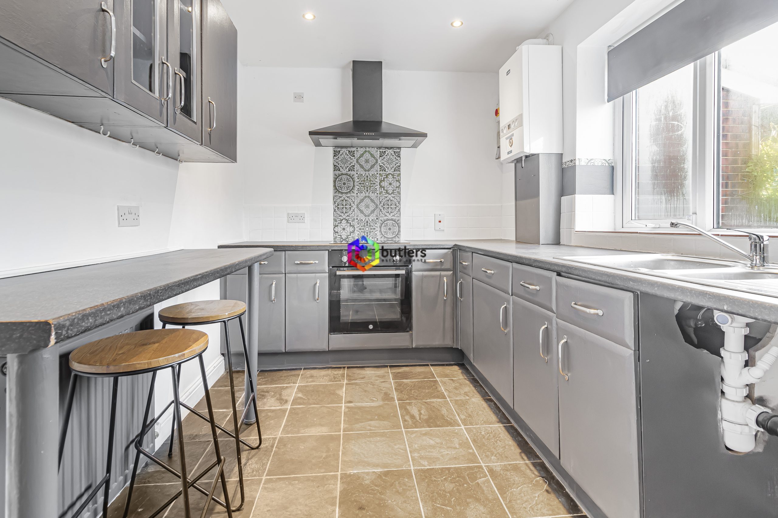 Fitted with a range of grey wall and floor mounted units with contrasting black work surfaces. There is a breakfast bar to one side of the room and a large rear facing window. The boiler is mounted to the wall.