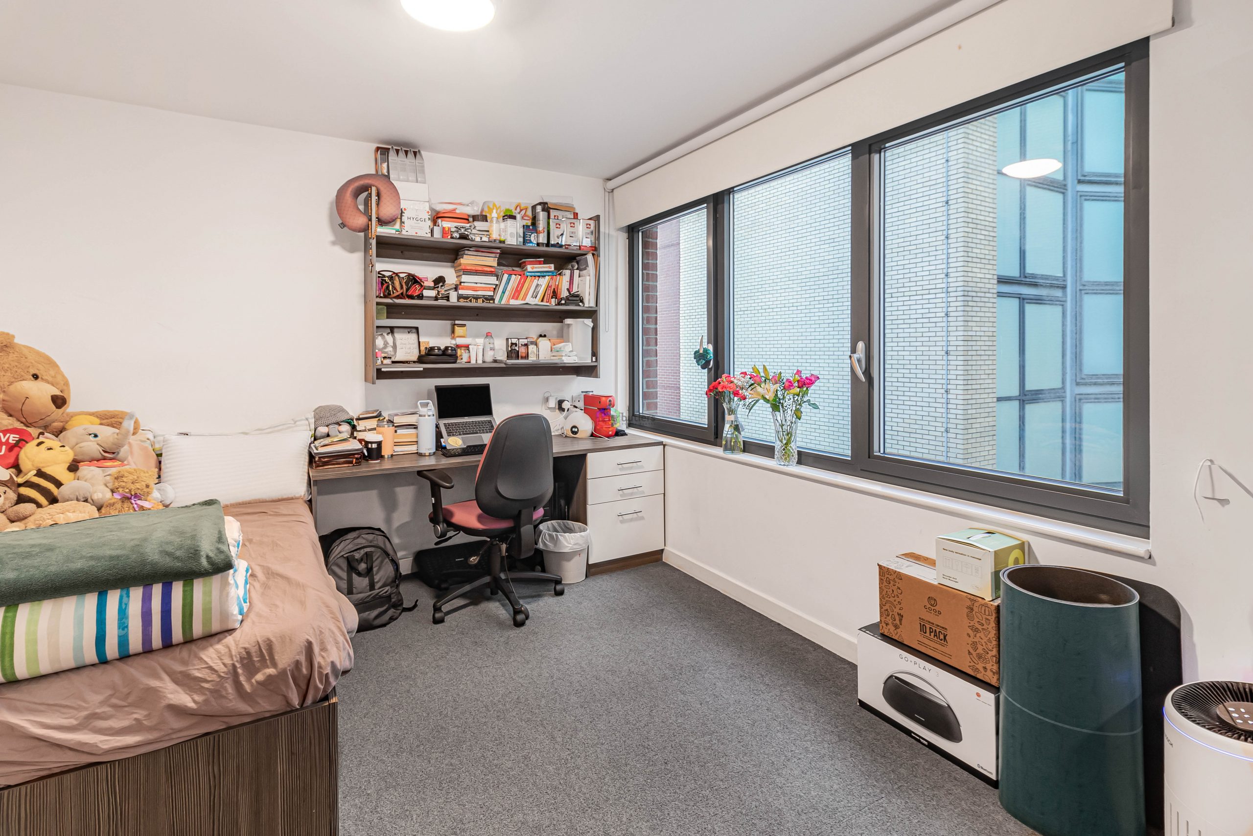 The bedroom/ lounge area has a large window to the side and is open plan to the kitchen area.