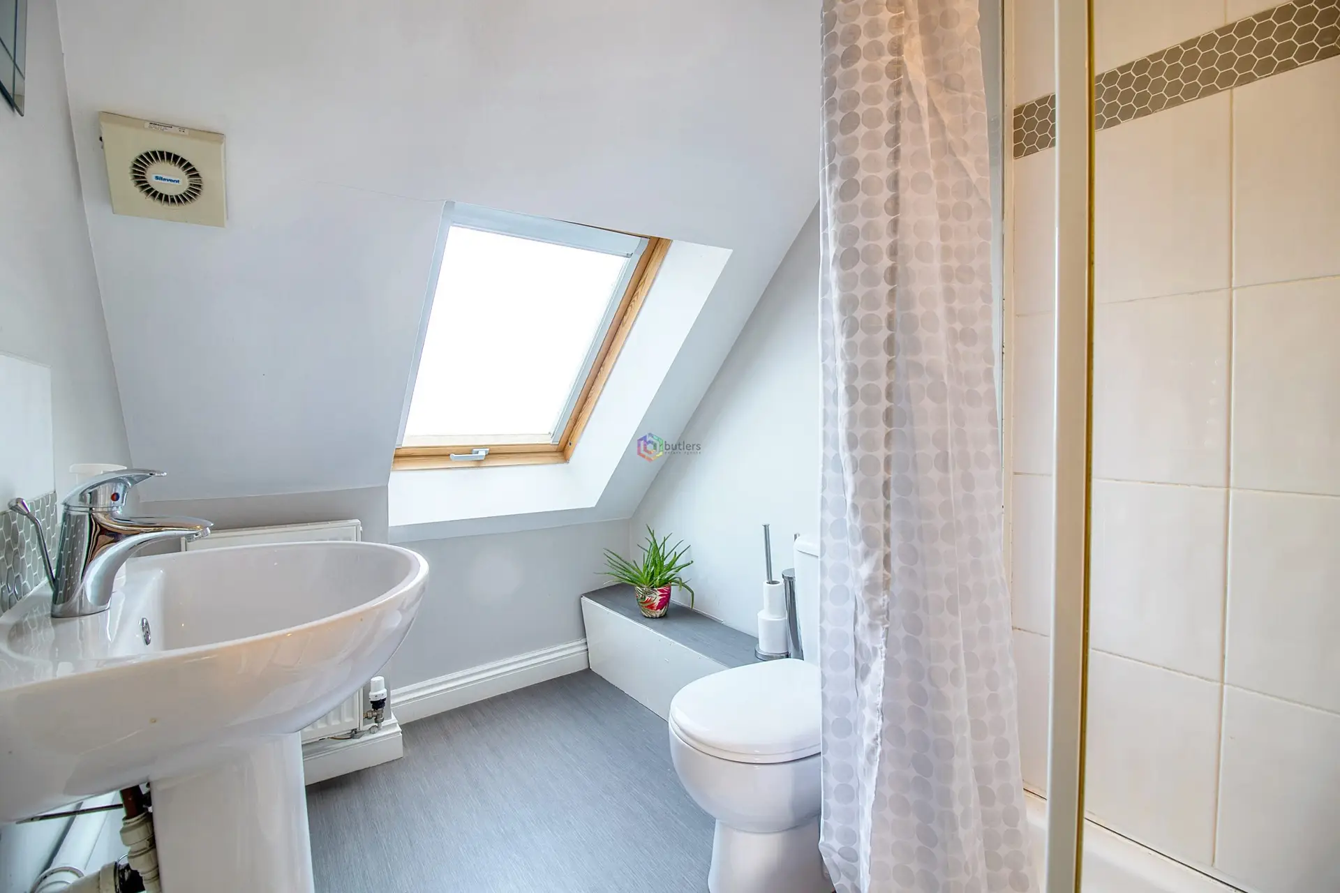 A fabulous en-suite with corner shower unit, white Wc and white wash hand basin on pedestal. There is a velux window to the rear.