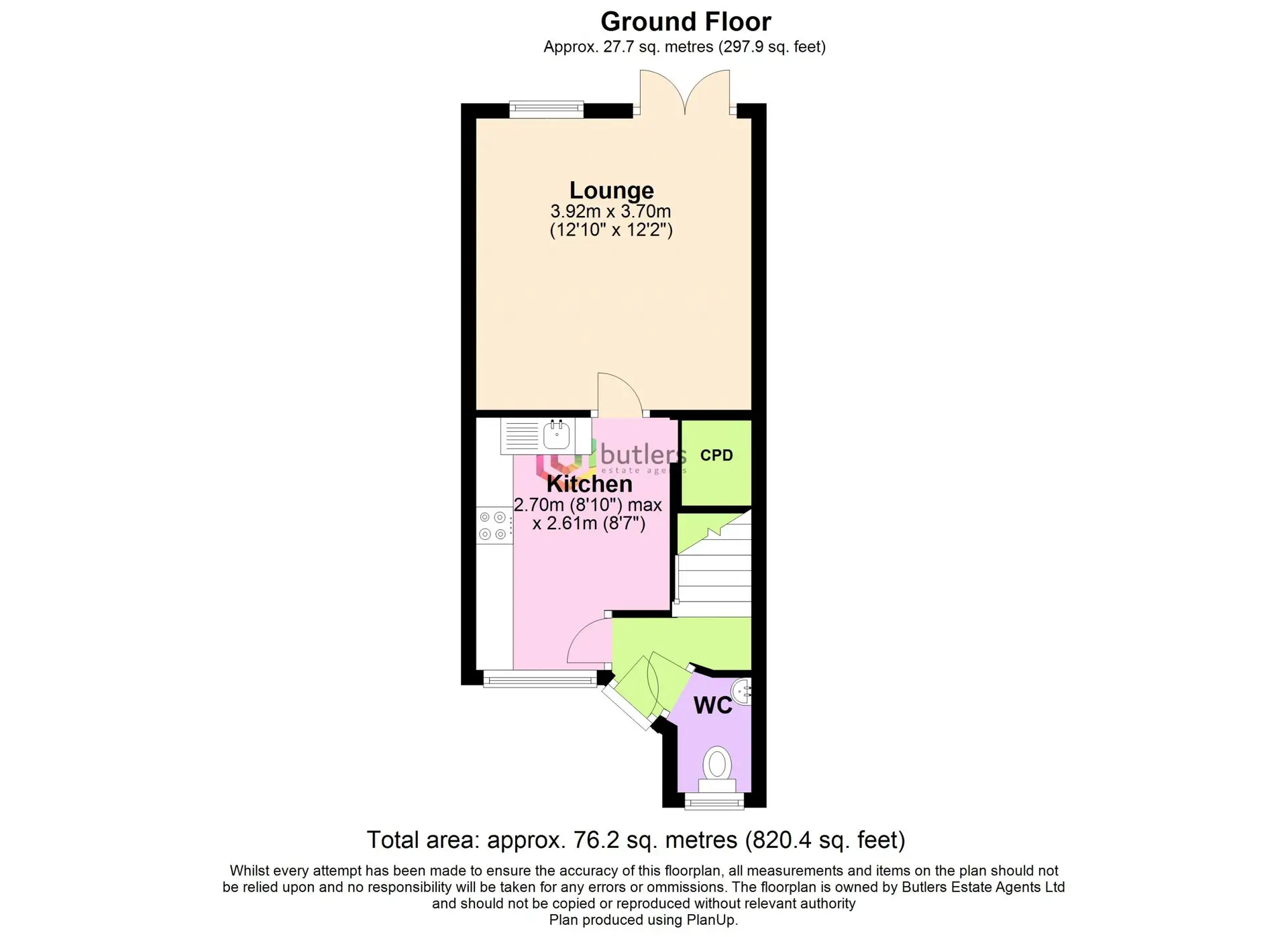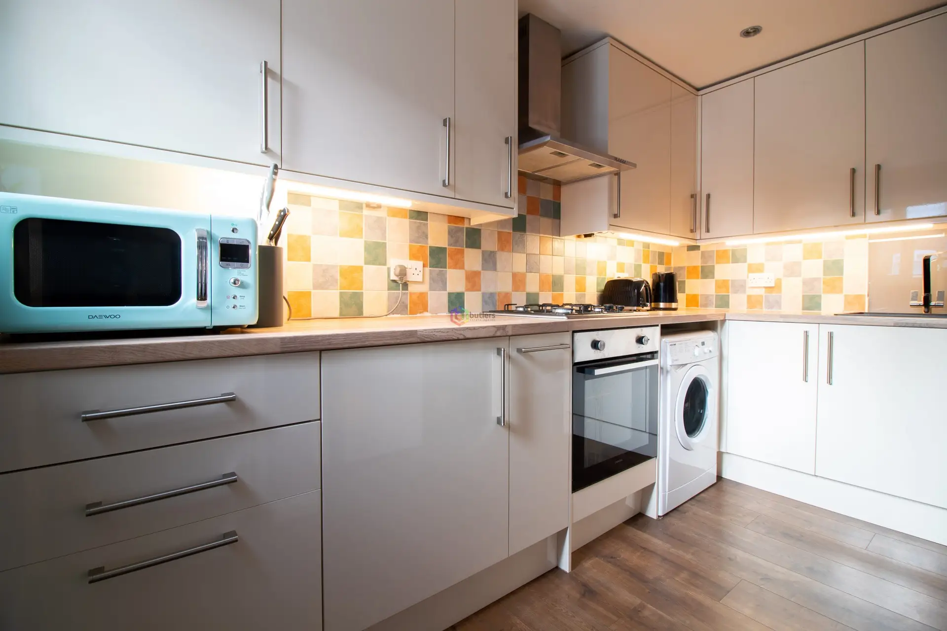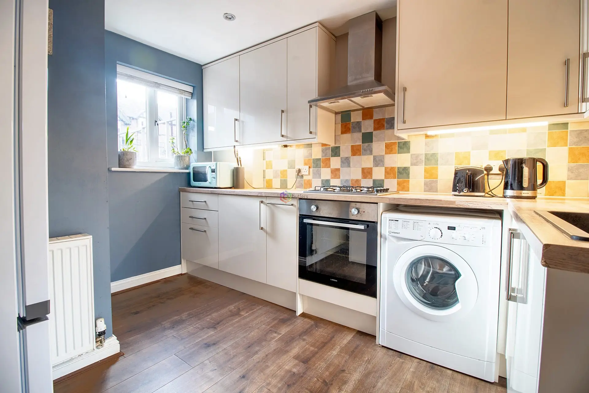 Located at the front of the house it is fitted with a range of wall and floor mounted cream gloss units with contrasting work surfaces. There is a stainless steel single electric oven, gas hob and extractor above. Space for a washing machine and fridge freezer. The understairs area make a nice storage area.