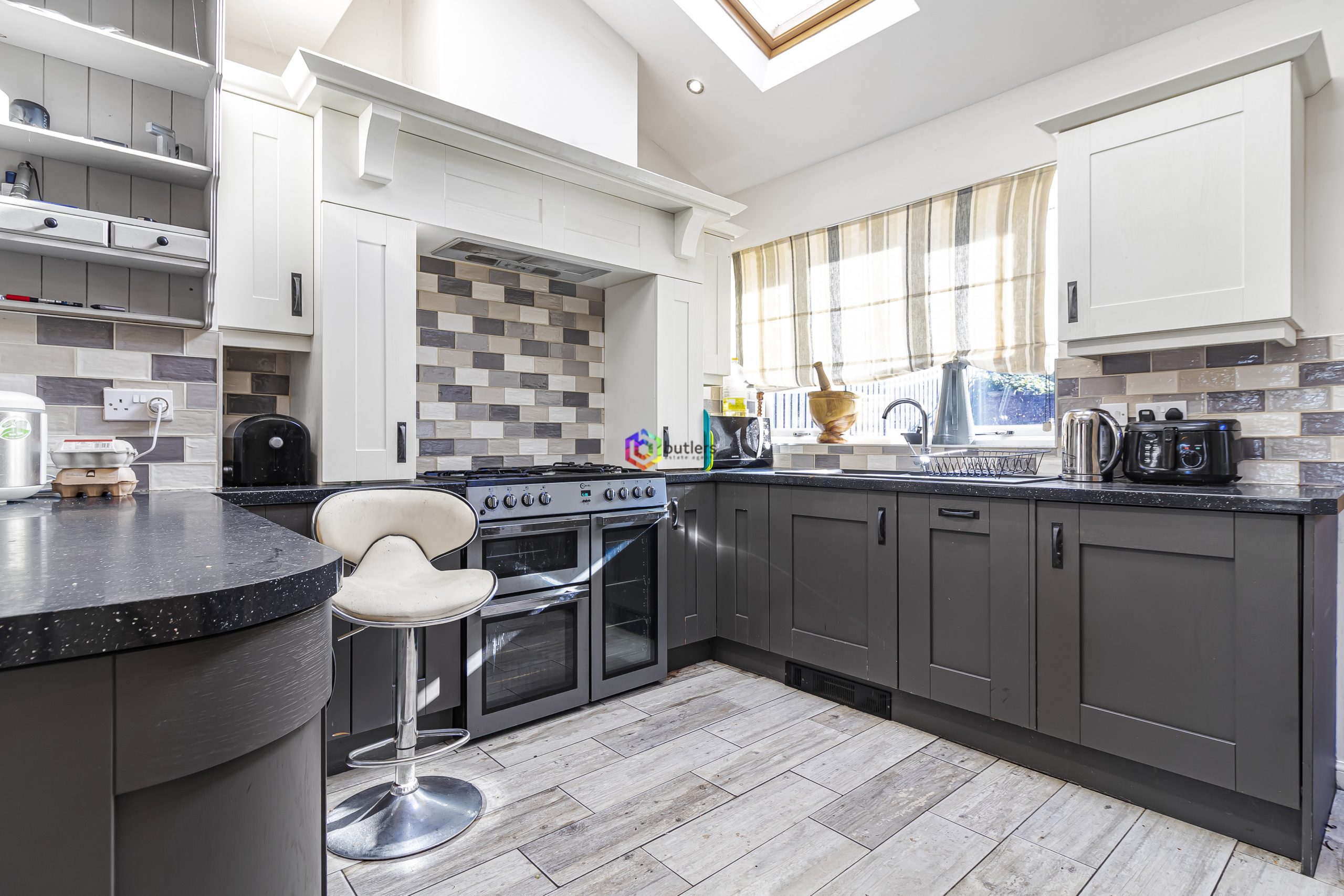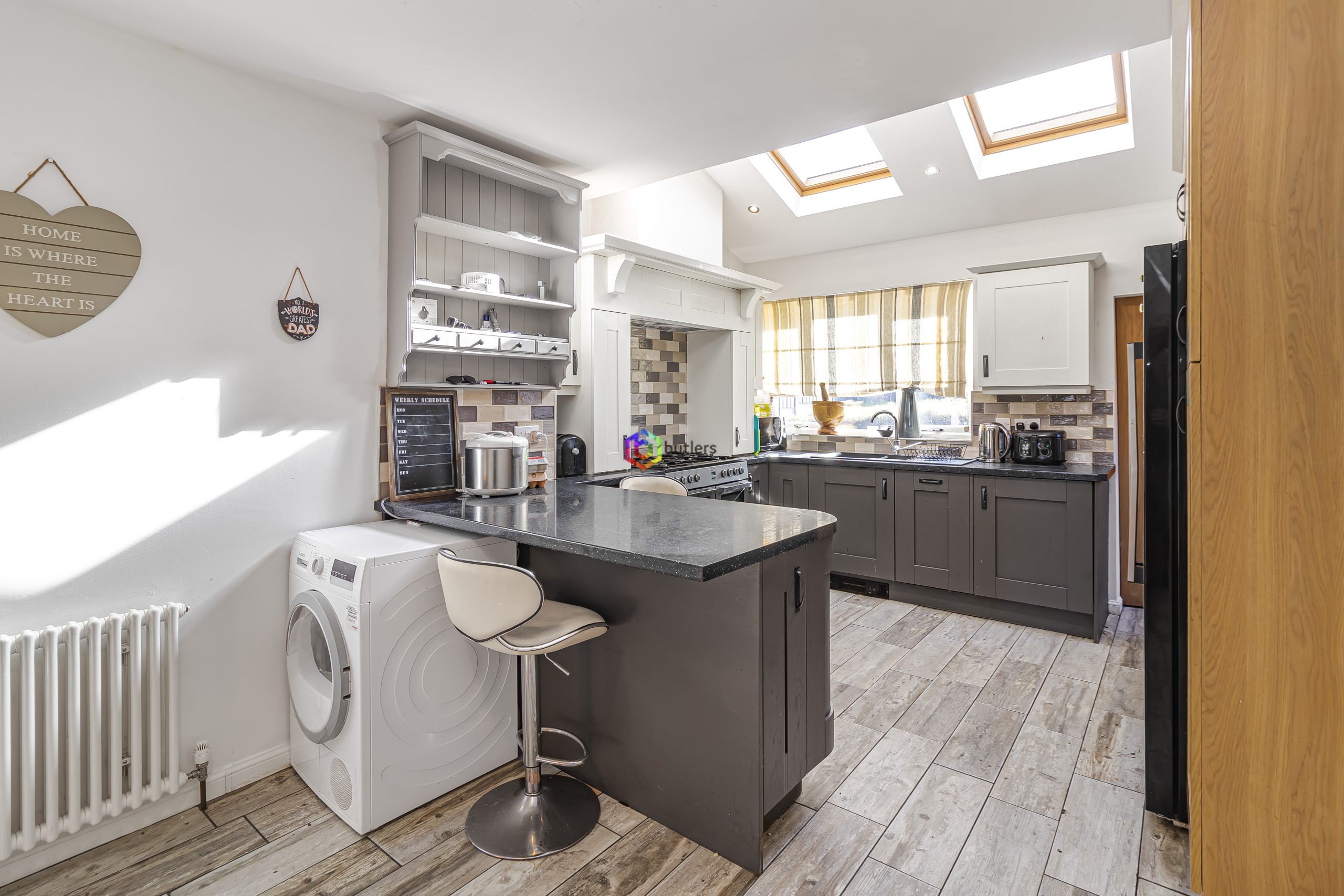 The extension to the original kitchen provides a lovely space for entertaining with grey base units with modern black worktops and contrasting white wall units. Integrated range cooker, fridge/ freezer and dishwasher. Its a great space for family and entertaining alike. A window looks over the rear garden and a door leads to the side of the property.