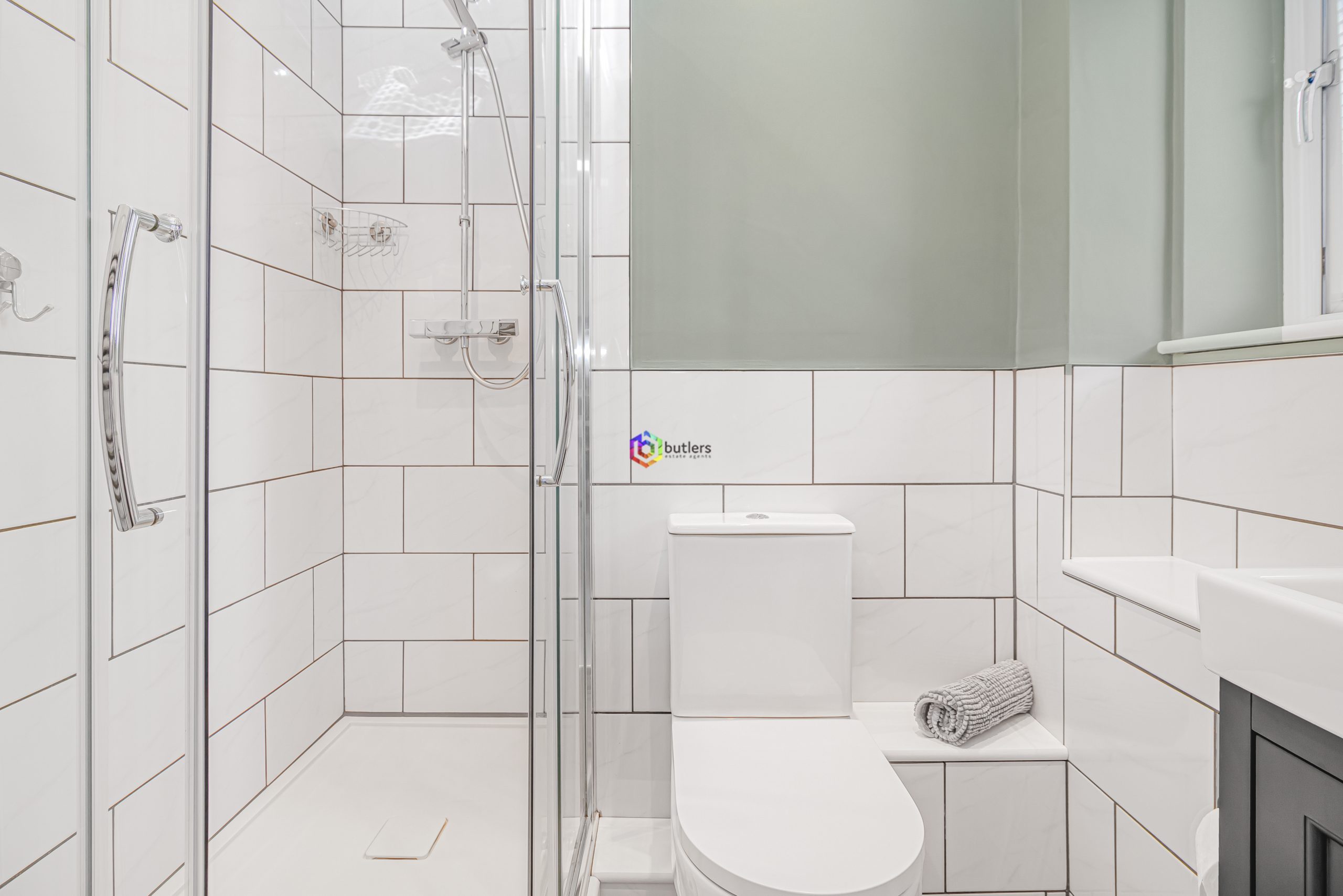 A superb modern En-Suite with a walk in shower area, white WC and a white wash hand basin inset to the vanity unit. There is a window to the rear.