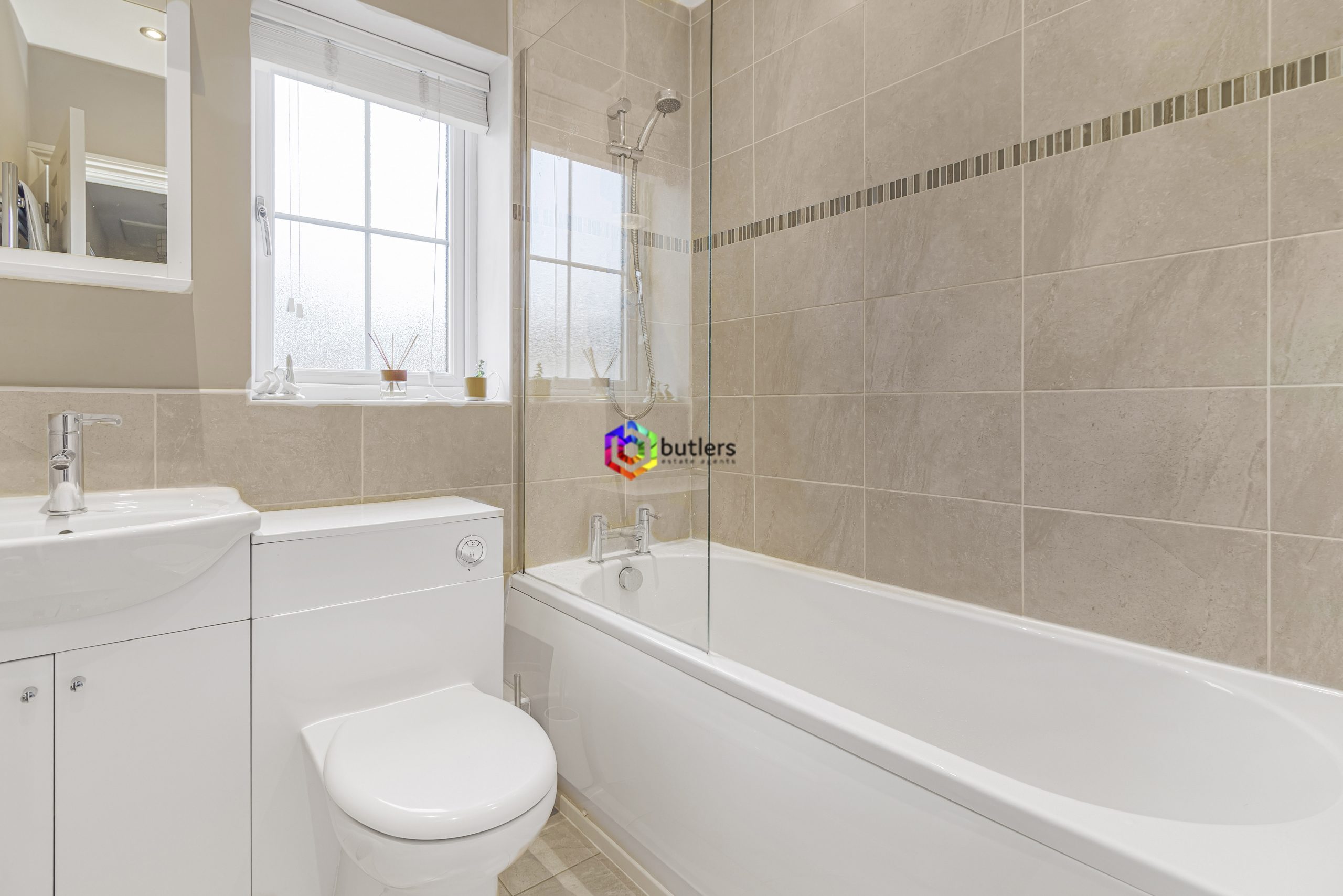 The bathroom is fitted with a white bath with a shower over and a glass screen, then a white WC fitted with a back-to-the-wall unit matching the vanity unit housing the white wash hand basin. There is a window to the front.