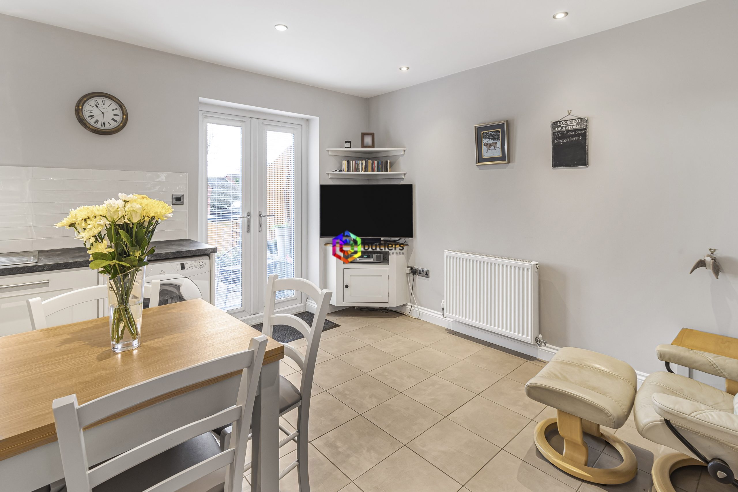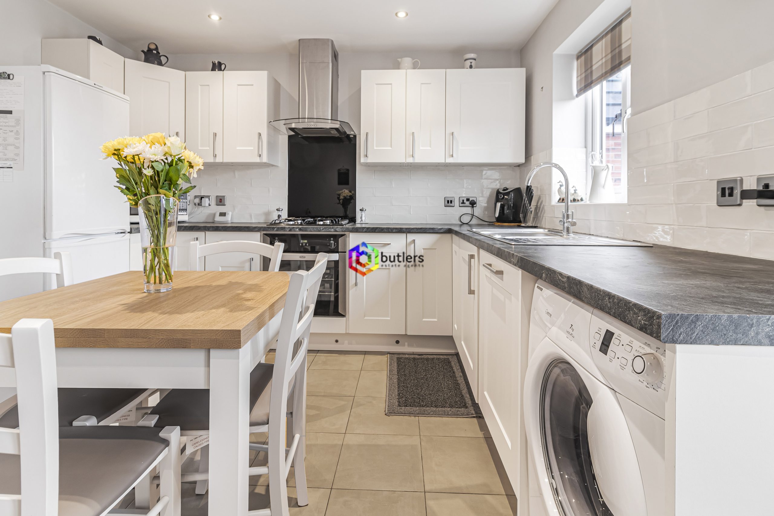 The kitchen diner spans across the rear of the house, fitted with white units and contrasting black worktops. Plenty of space for the dining table and chair set with twin patio doors to the rear.