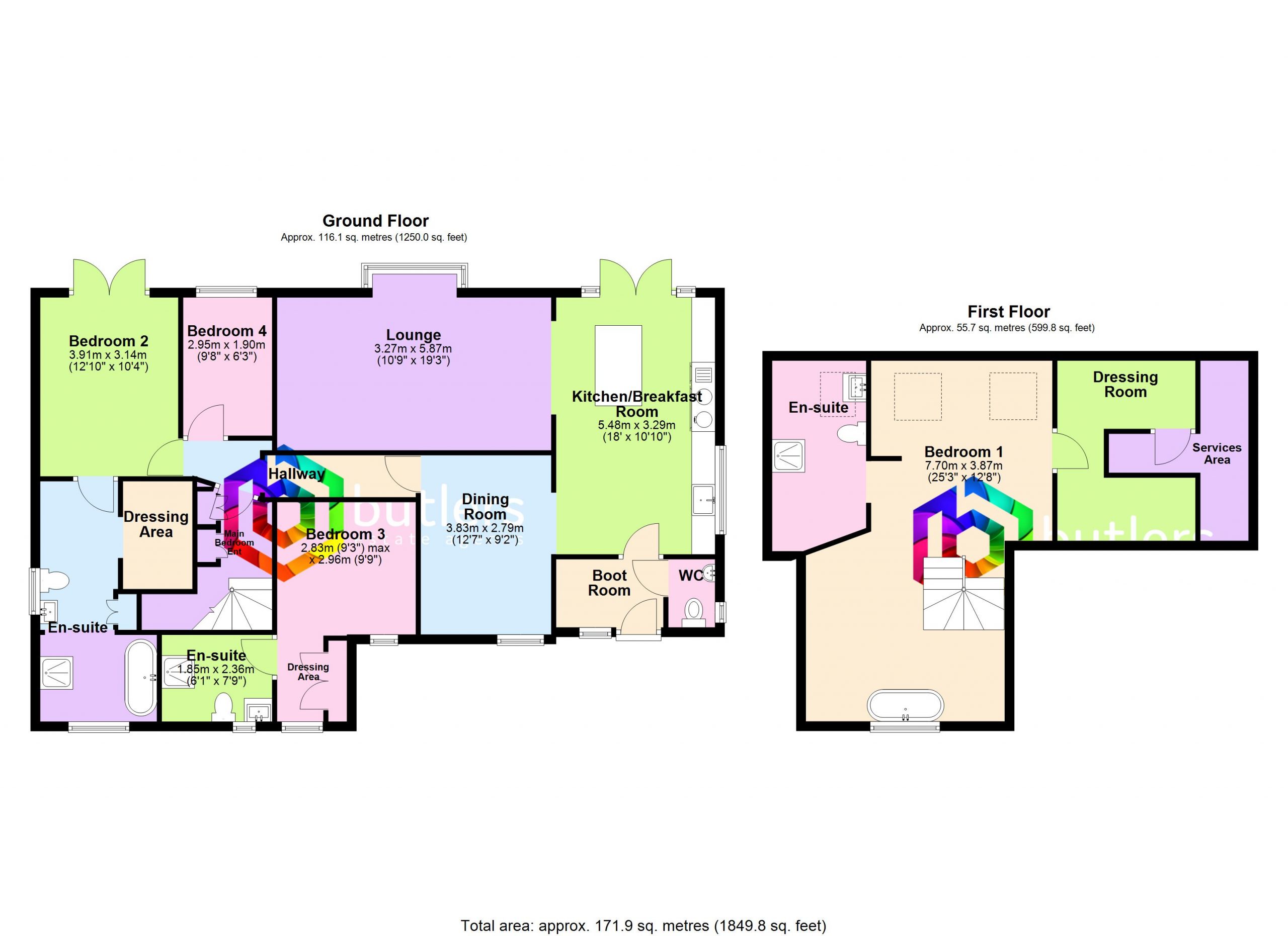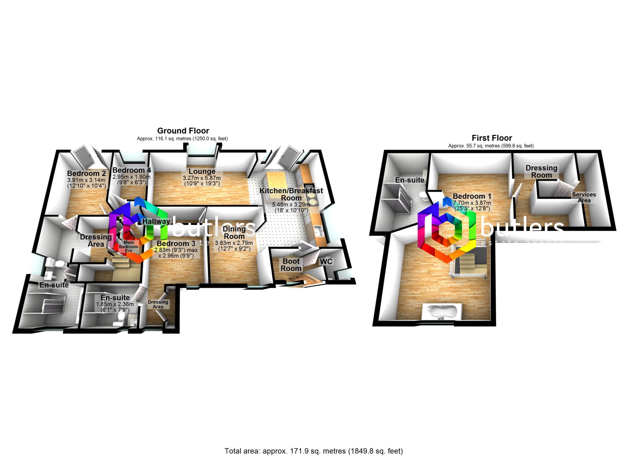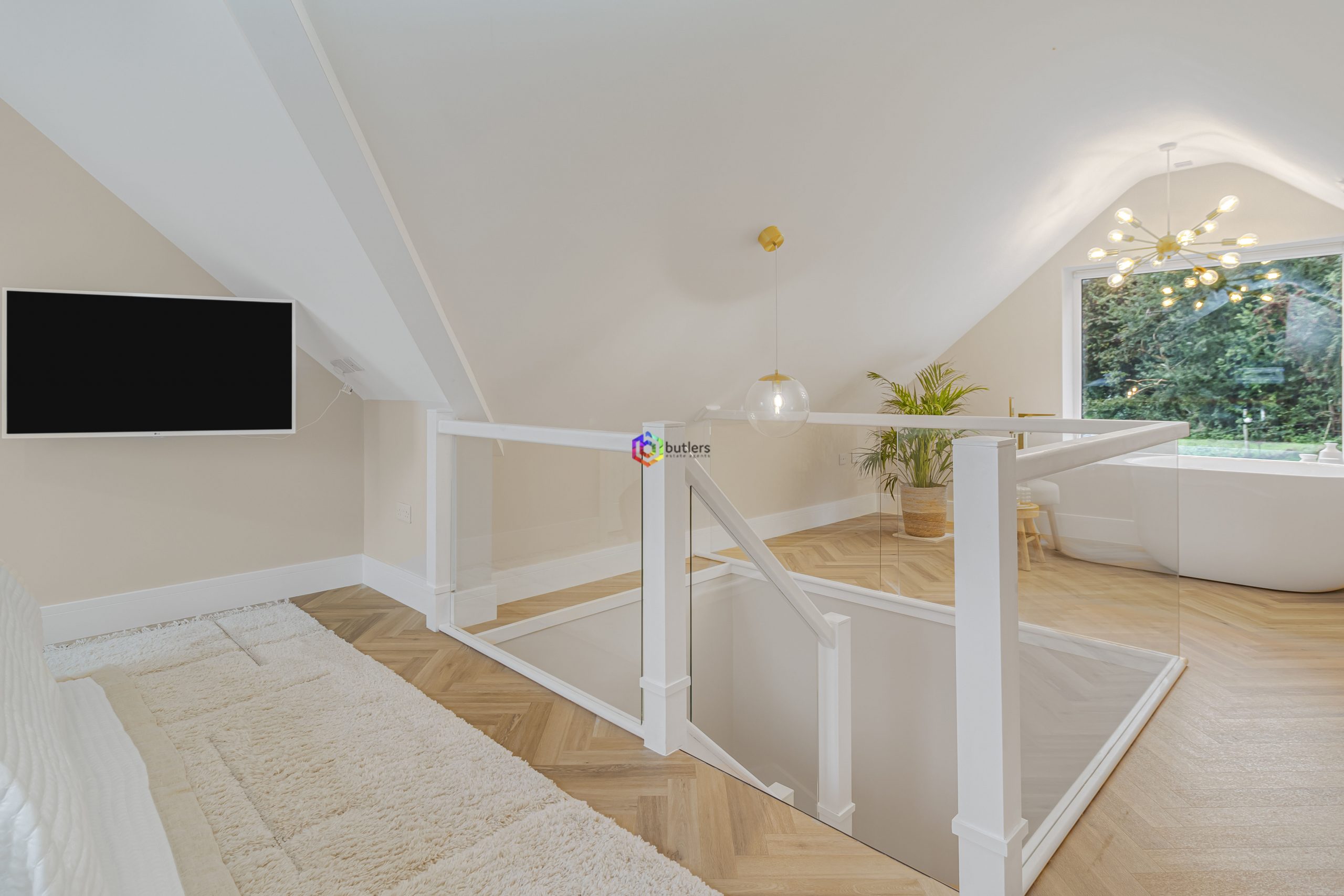 As you step inside, be mesmerised by the grandeur of the main bedroom suite, featuring a stunning glass staircase, a sumptuous freestanding bath, and a separate shower room. Two additional bedrooms come complete with their own dressing rooms, adding a touch of opulence to every-day living.