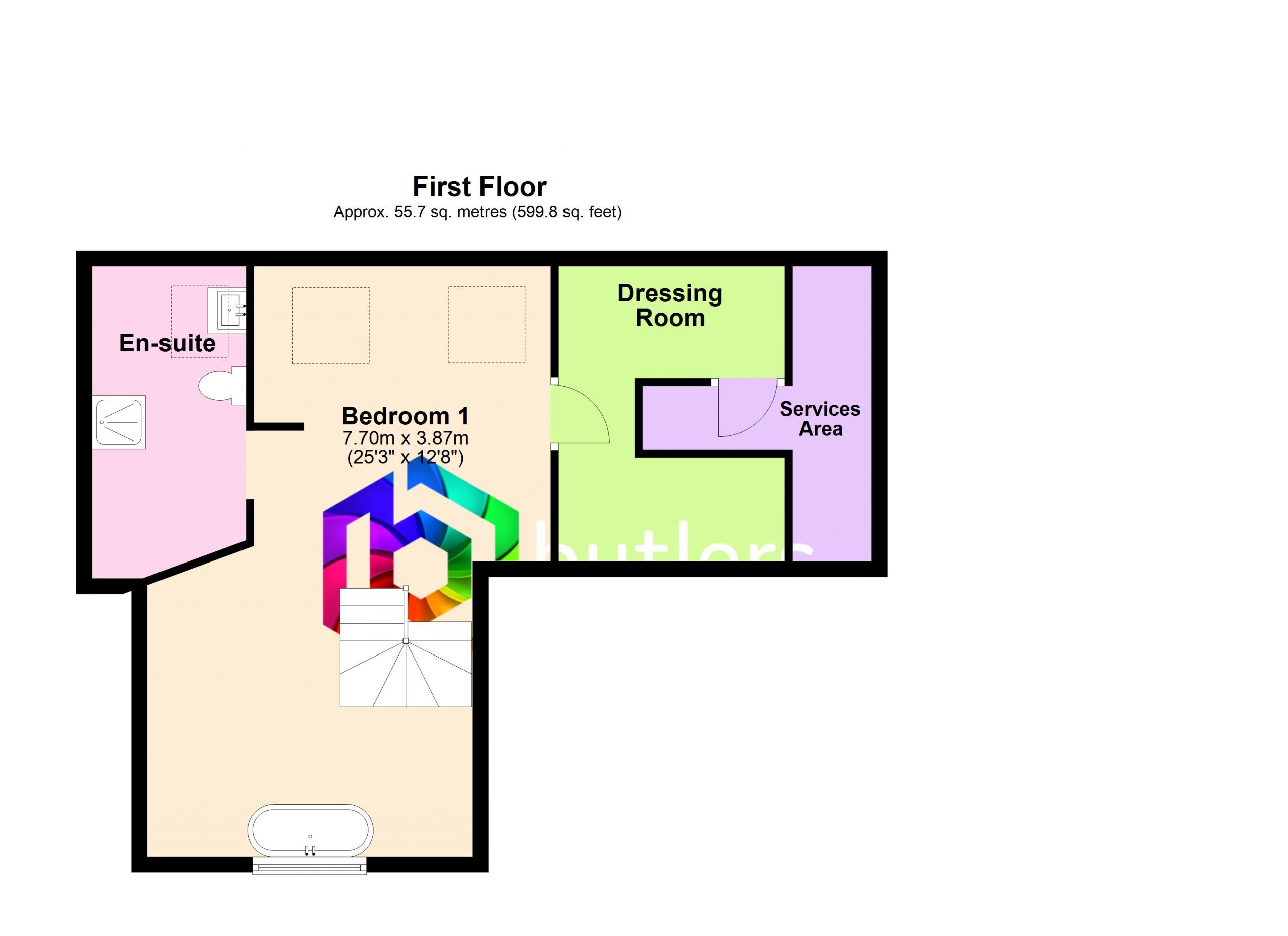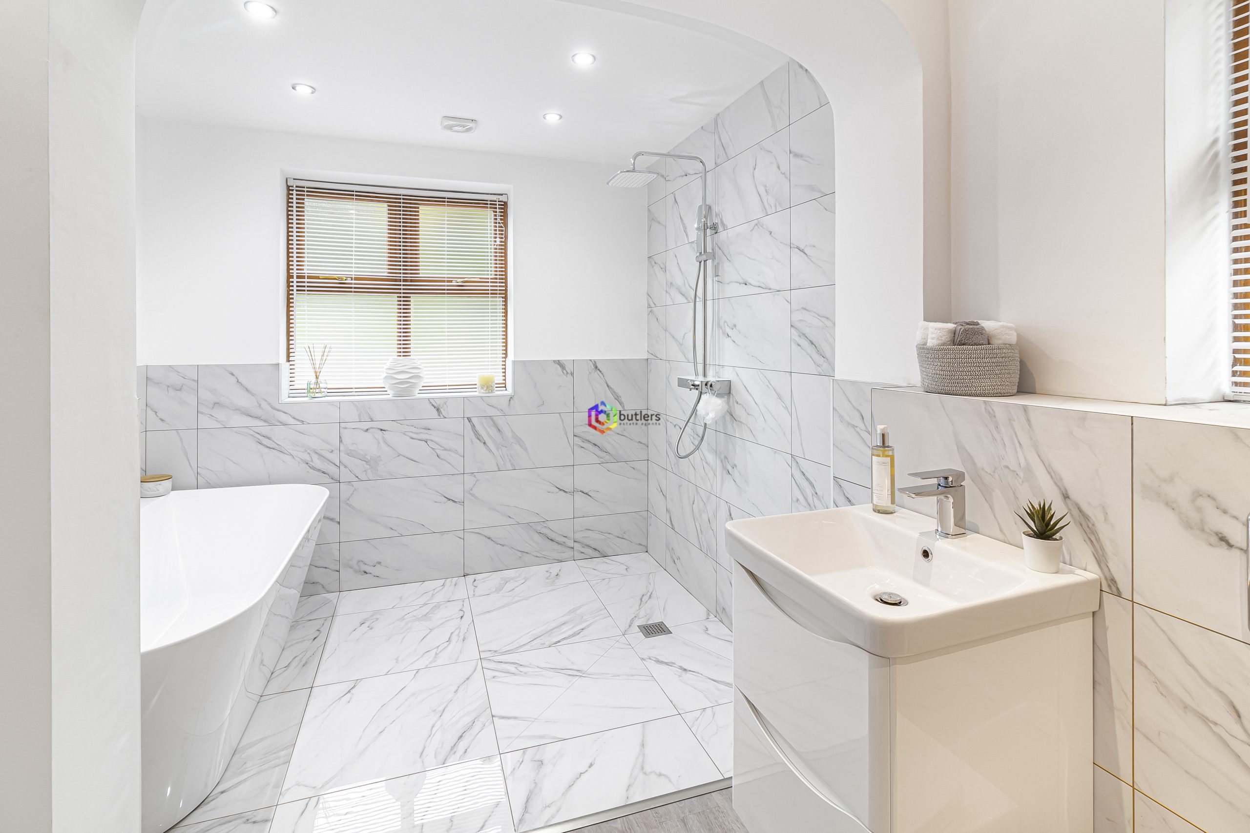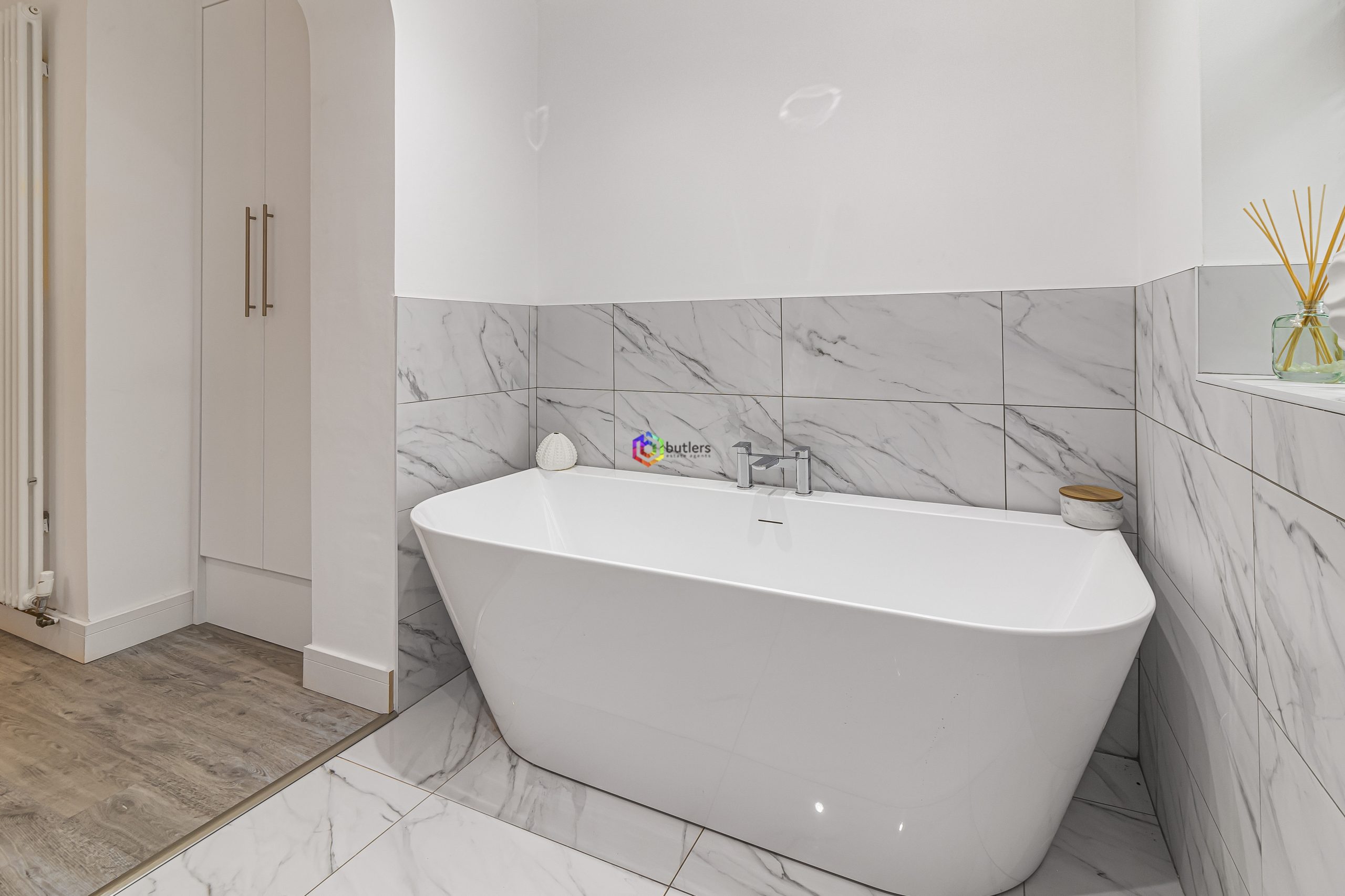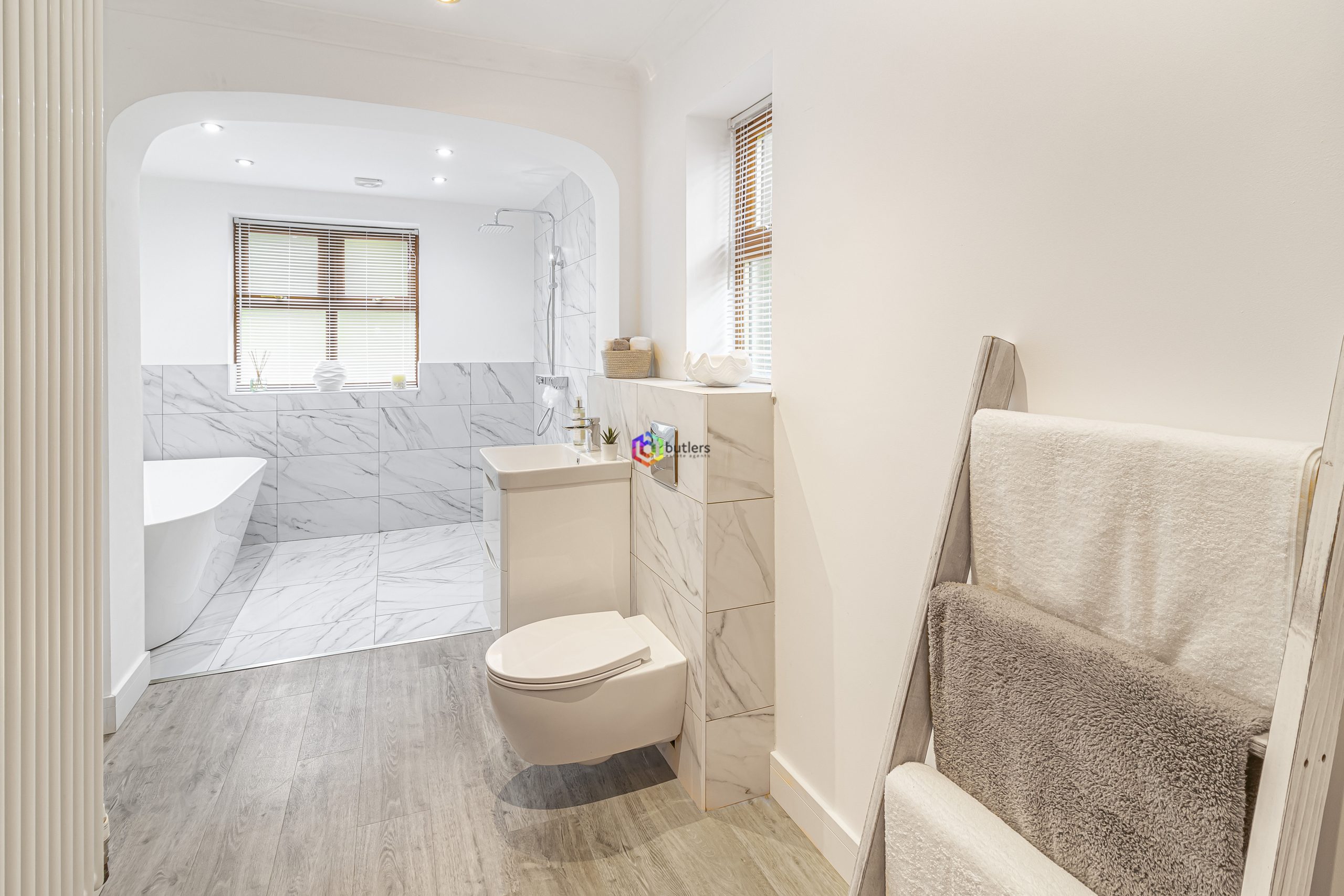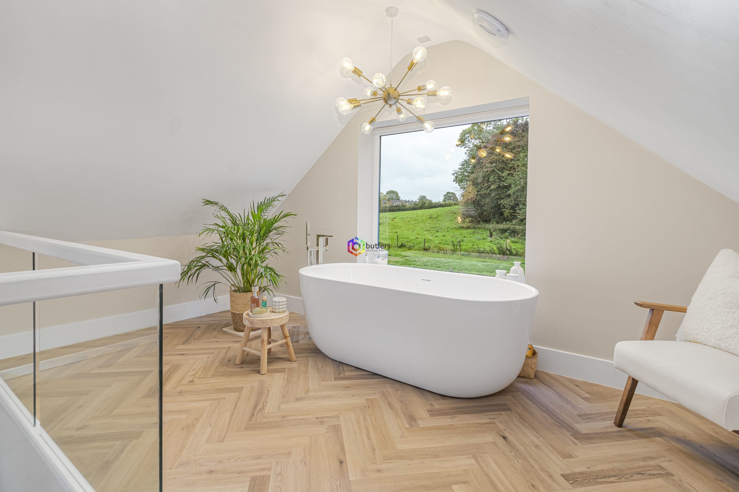 On entry to the room you are focused on the freestanding bath and wet room style shower with a front facing window, this is a large area to relax in the bath. The first part of the room has a sink in a vanity unit and a back to the wall WC. There is a wardrobe and a full dressing area providing everything you need for your daily routines.