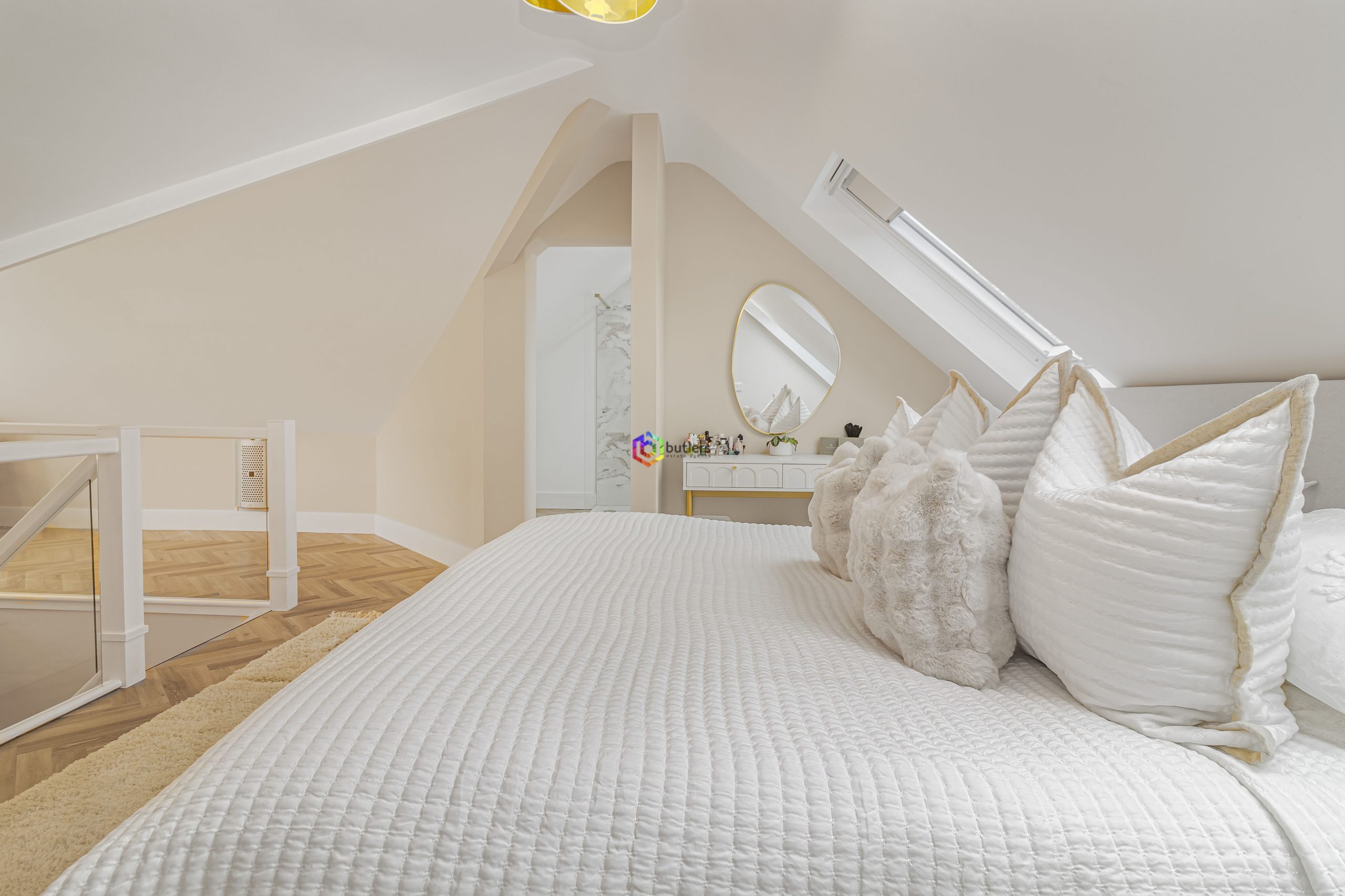 As you arrive at the top of the stairs you are drawn to the freestanding bath in front of the large square window to the front of the house designed to soak and look at the stars. Its such a luxurious space with air conditioning for when it gets hot. This area is again open plan to the bedroom area which has great design to form a natural area for the dressing table being hidden yet accessible. Two velux windows above the bed provide natural light.