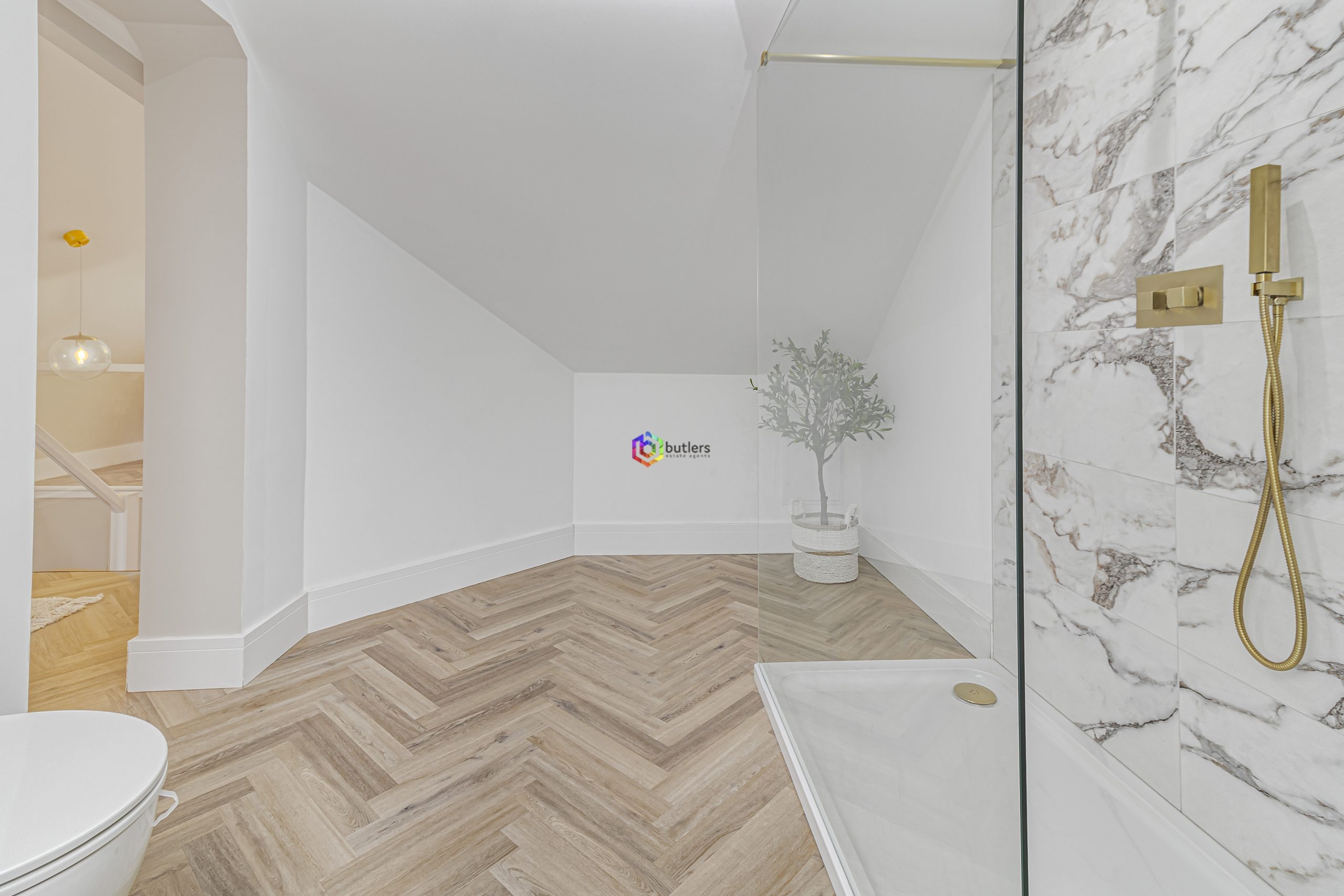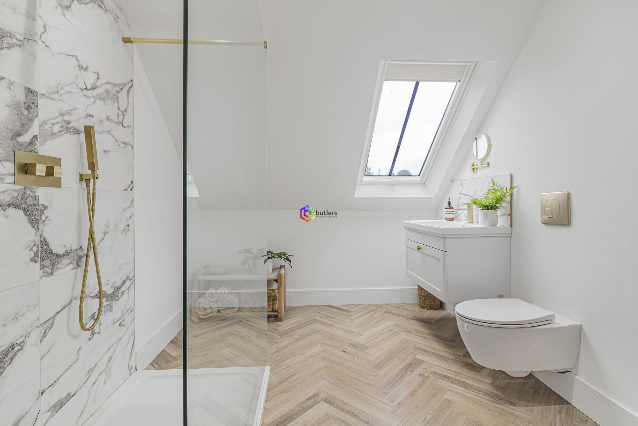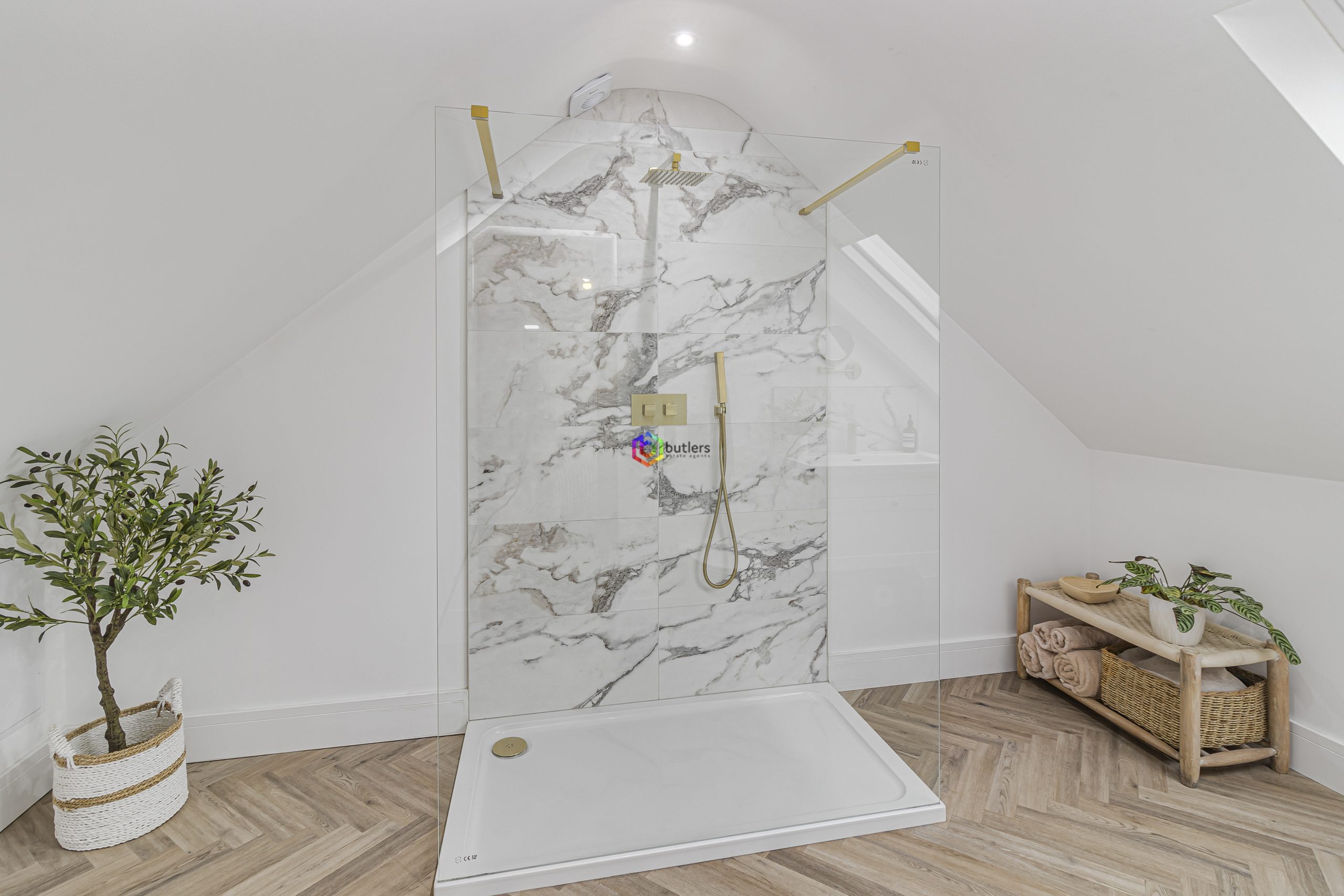 An opening leads you through to the En-Suite shower room which has a glass wall creating the shower area opposite the vanity unit housing the modern sink and back to the wall WC. A velux is located just above the sink.