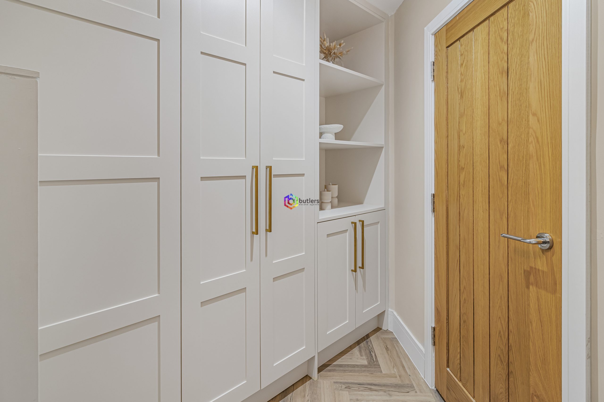 A door from the hallway on the ground floor leads into a dressing room fitted with bespoke furniture making great use of the space on offer.