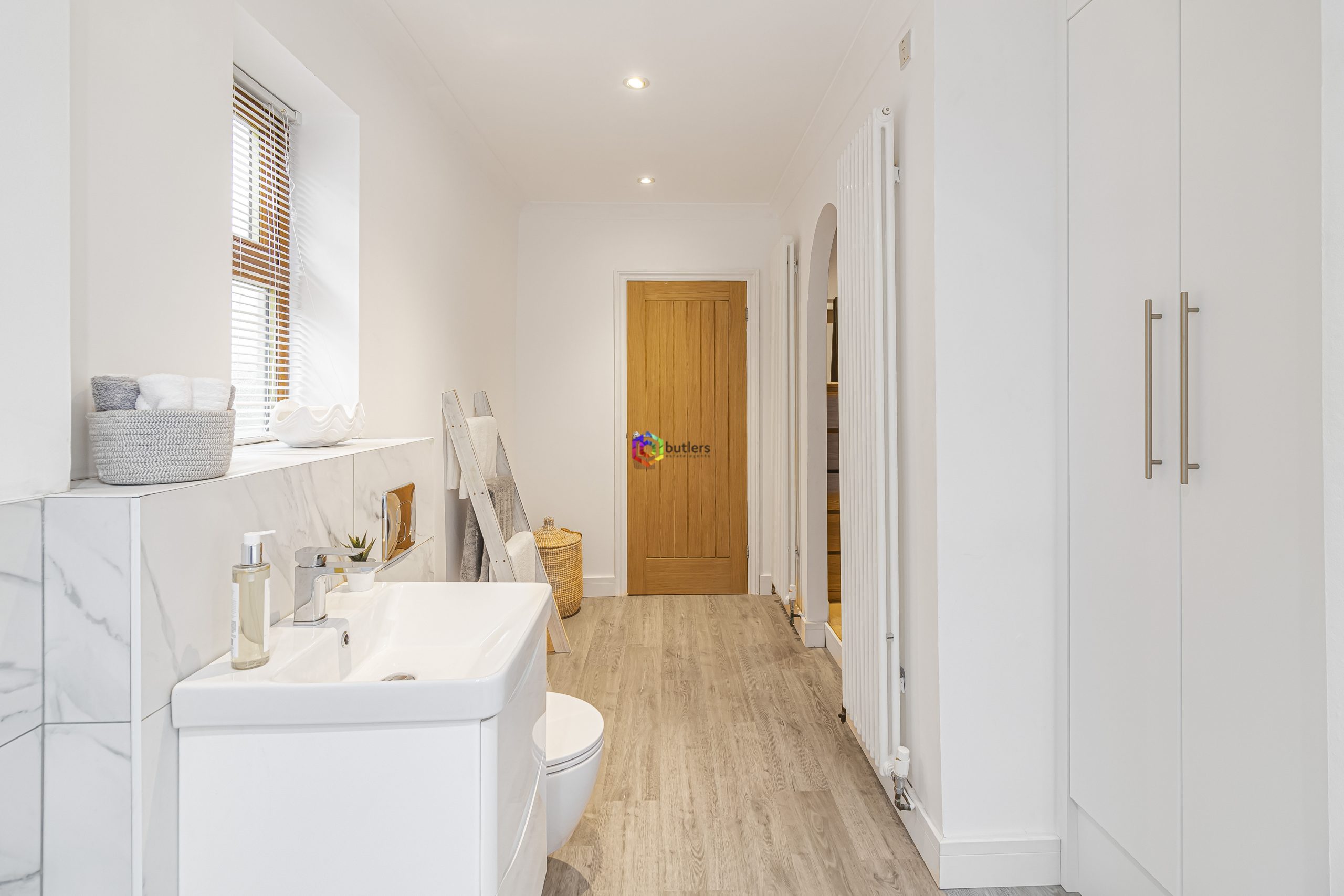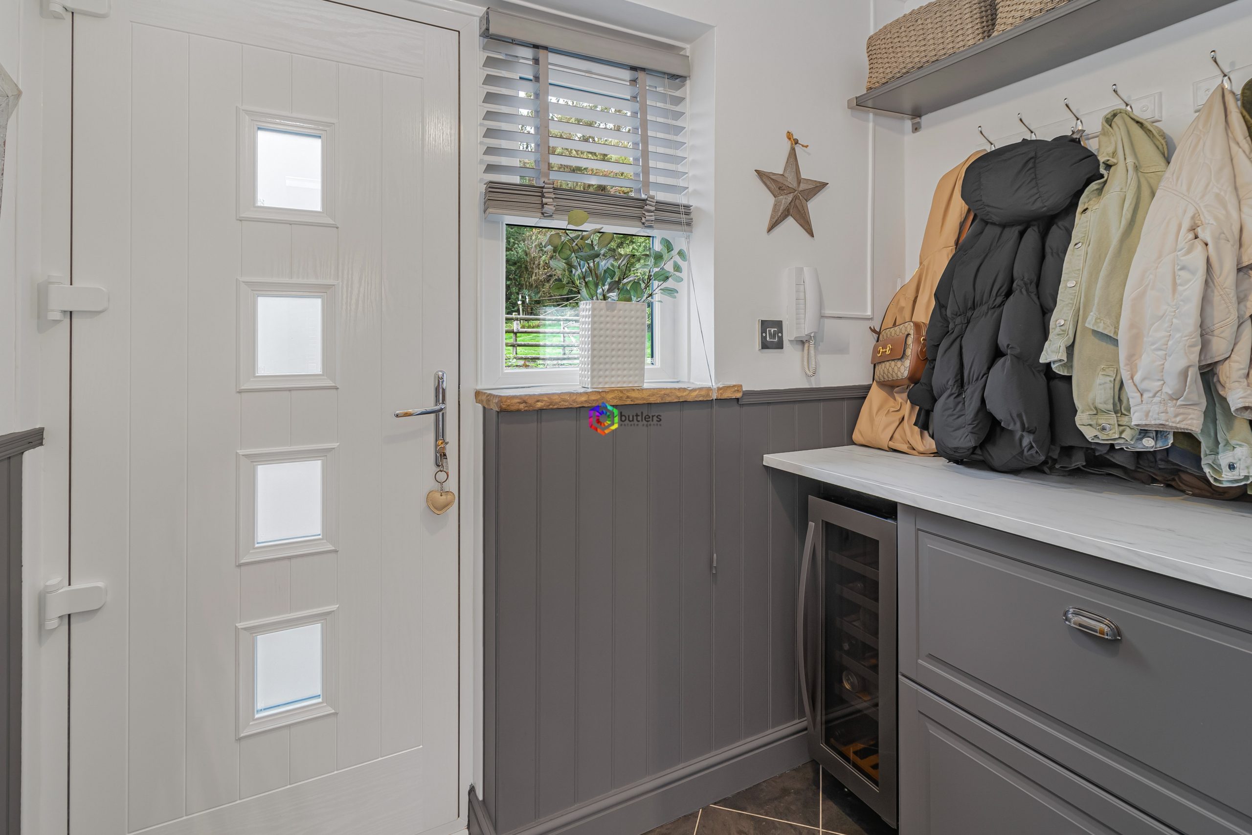 The modern grey front door leads you into the Boot Room with panelling to half height, coat hooks, storage drawers and worksurface along with a handy wine cooler. Access is gained to the WC and the Kitchen / Breakfast room.