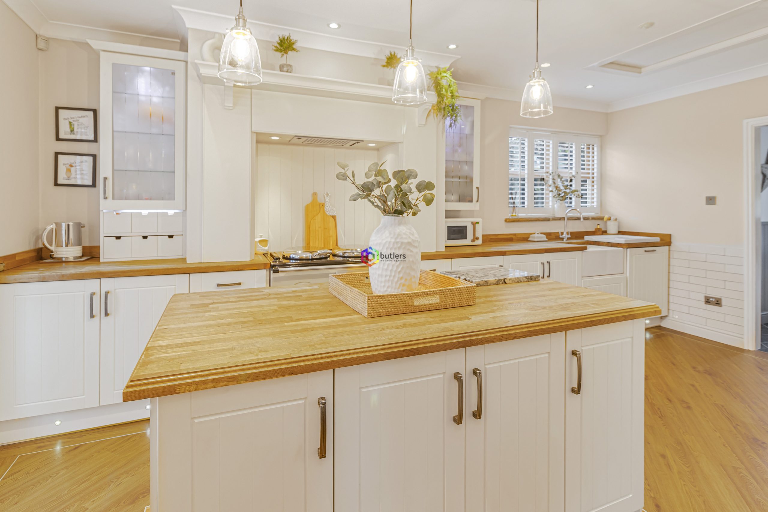 Take a look at this amazing kitchen / breakfast room fitted with a range of wall and floor mounted units in white with oak block style worksurfaces, lots of storage and a pleasure for any chef to work in. There is a range cooker cleverly designed as the focal point of the room with the adjacent island providing more space. Integrated fridge, freezer and dishwasher along with the seating area next to the twin doors leading to the rear garden provide all the expected benefits of a luxury home like this. An open plan design leads through to a formal lounge area creating a great space for families and entertaining alike.