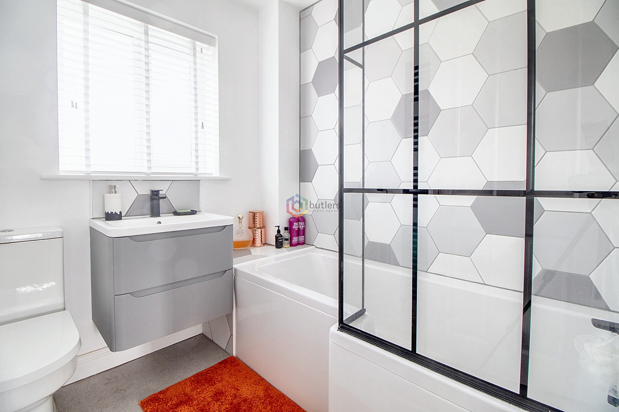 The modern bathroom has a white bath with shower over and black modern Georgian glazed shower screen, there is a white Wc and a wall hung sink in a modern grey vanity unit. Everything you need for a relaxing soak or the busy family routine.