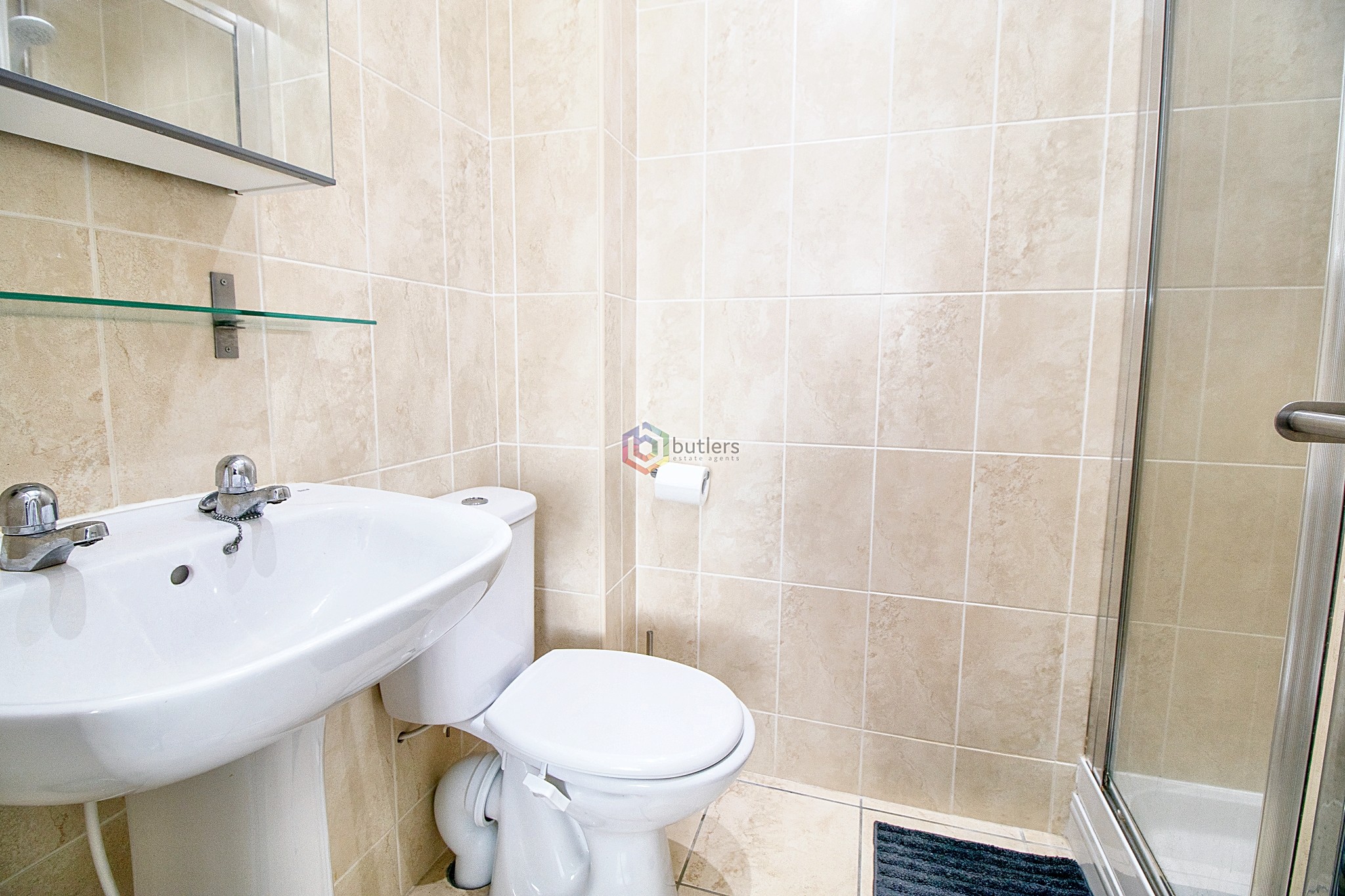 Convenience for the adults the room is fitted with a shower cubicle with white tray and glass door, there is a white Wc and a white wash hand basin on pedestal.