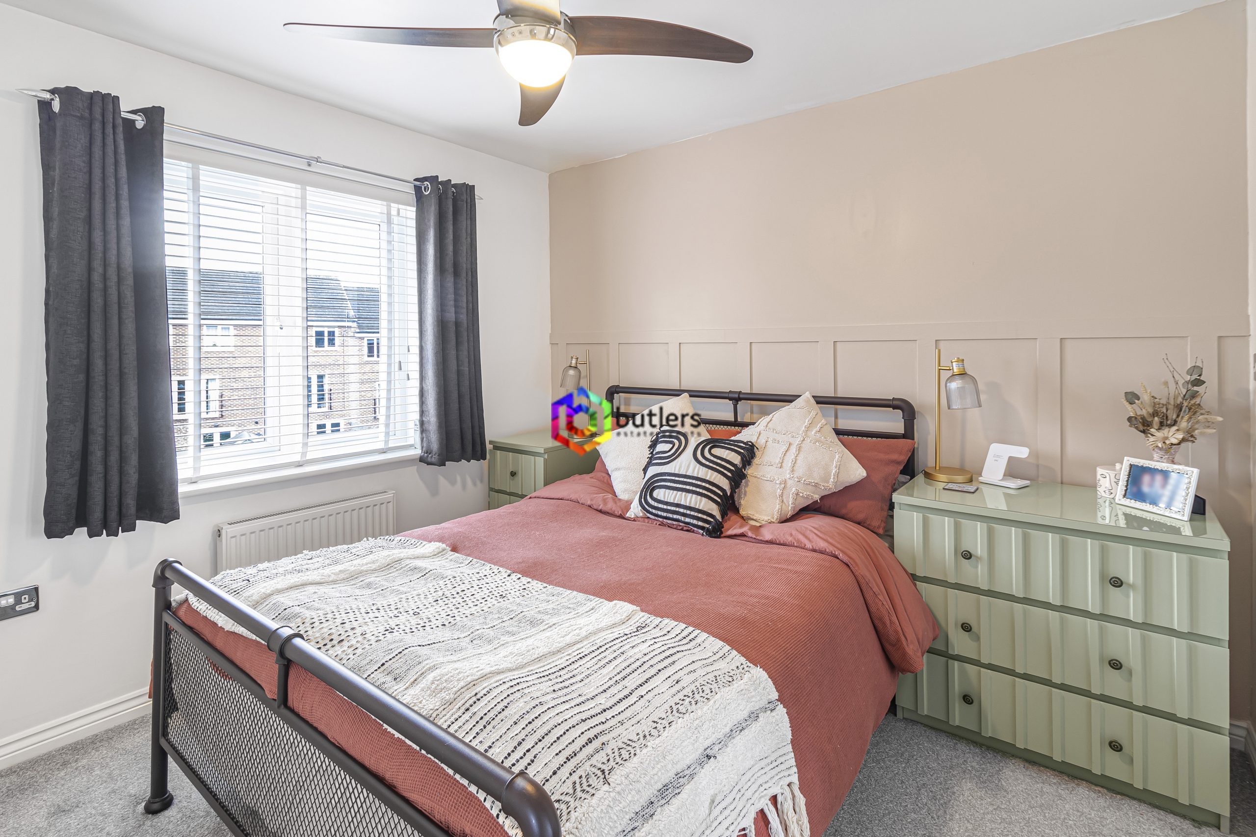 With its modern wood panelling and colour to one wall, this space invites you to relax and recharge, there is a window to the rear and access to the En-suite.