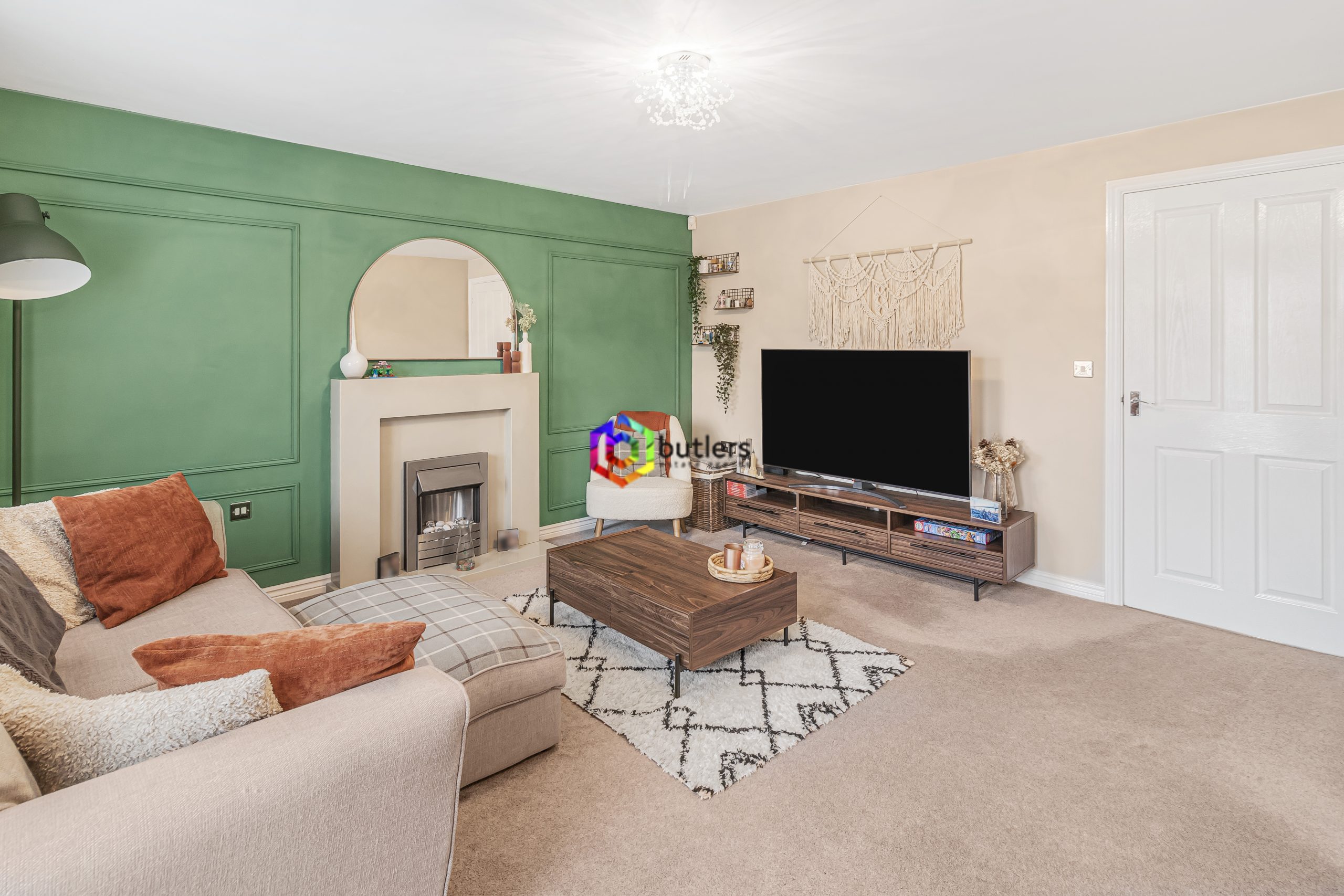 The lounge is located at the rear of the house, with wood panelling decorated in modern colours with a fireplace as the focal point of the room. Super space to unwind with room for a dining table and chairs in front of the twin patio doors that lead out to the rear garden. There is a generous under-stairs storage cupboard.