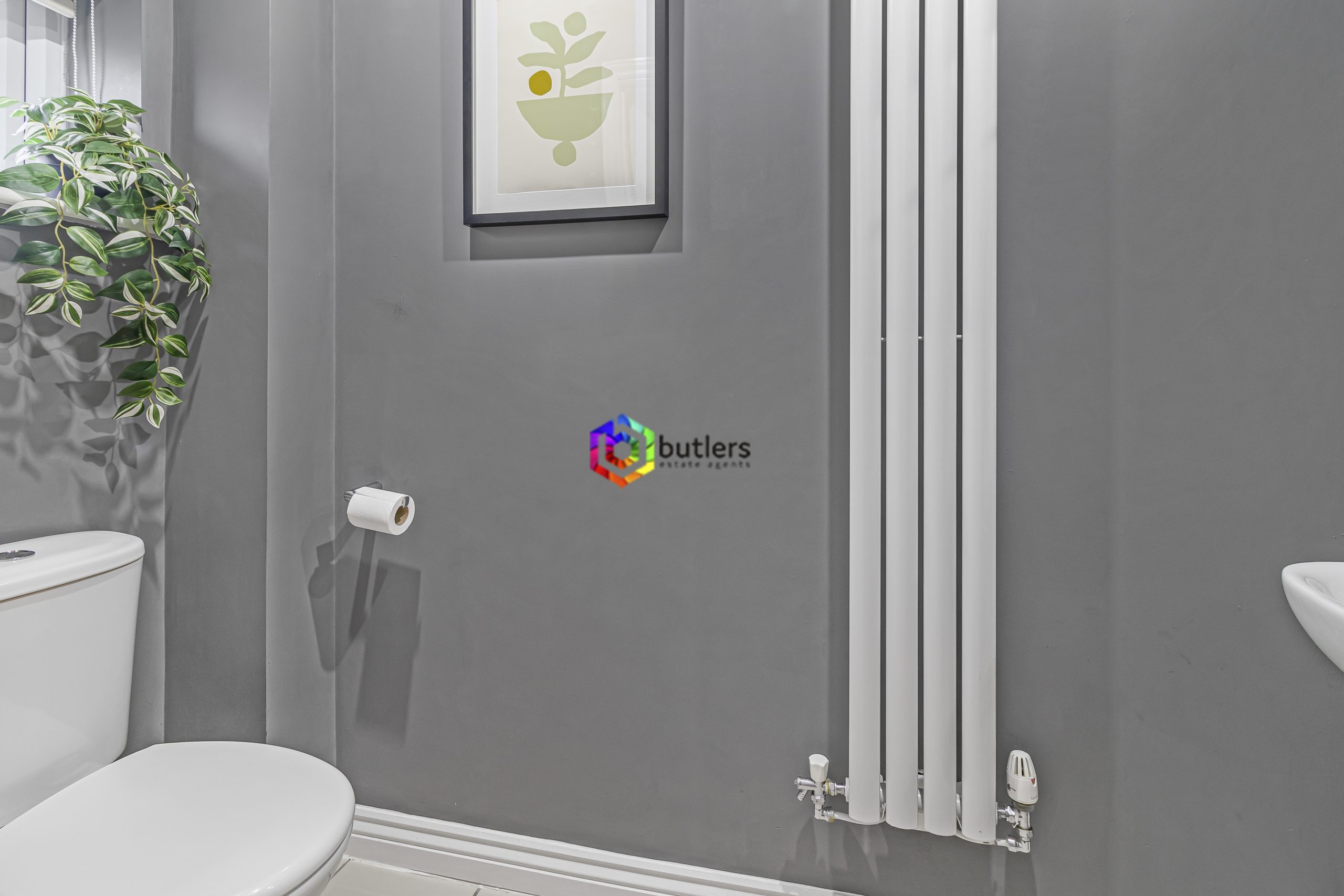 This downstairs WC is decorated in modern grey colours with a vertical radiator, white Wc and a white wash hand basin. There is a window to the front.
