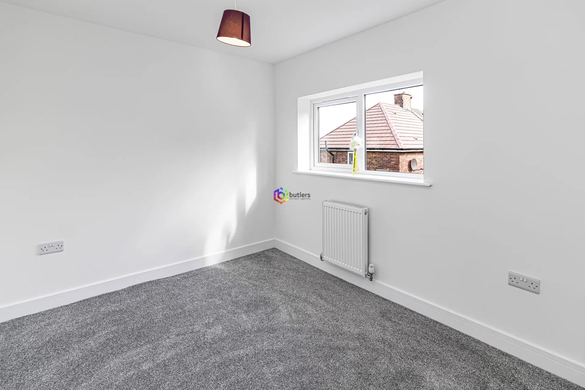 A double bedroom with modern white decor and a window to the front.