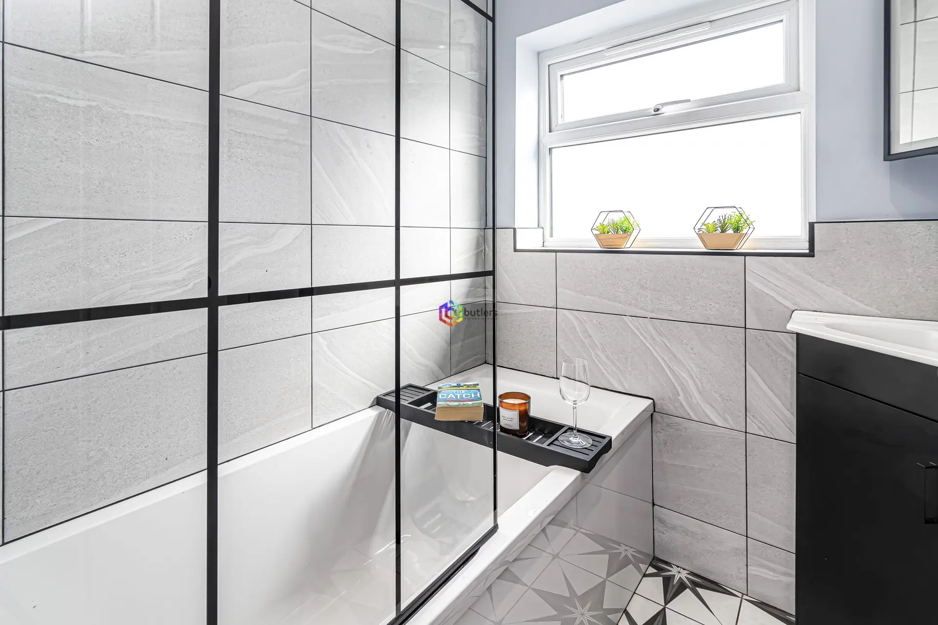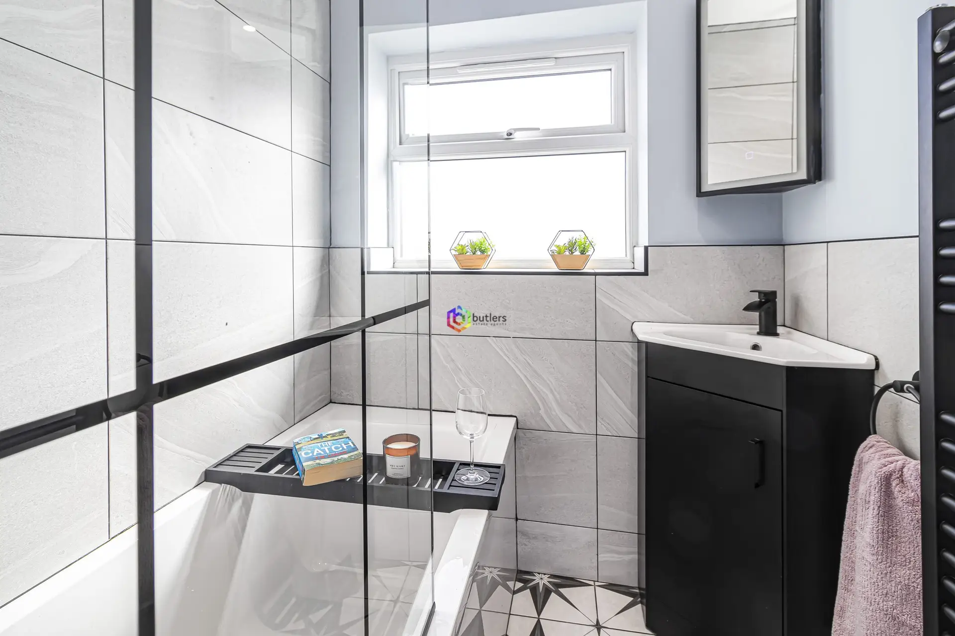 The modern bathroom has large tiles surrounding the wet areas. There is a corner white wash hand basin in a vanity unit and a white bath with shower over and modern georgian black glazed screen.