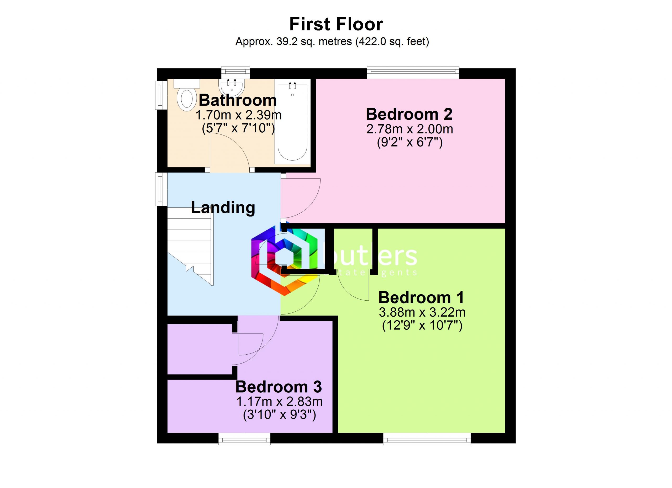 Bedroom Three 3' 10" x 9' 3" (1.17m x 2.83m)