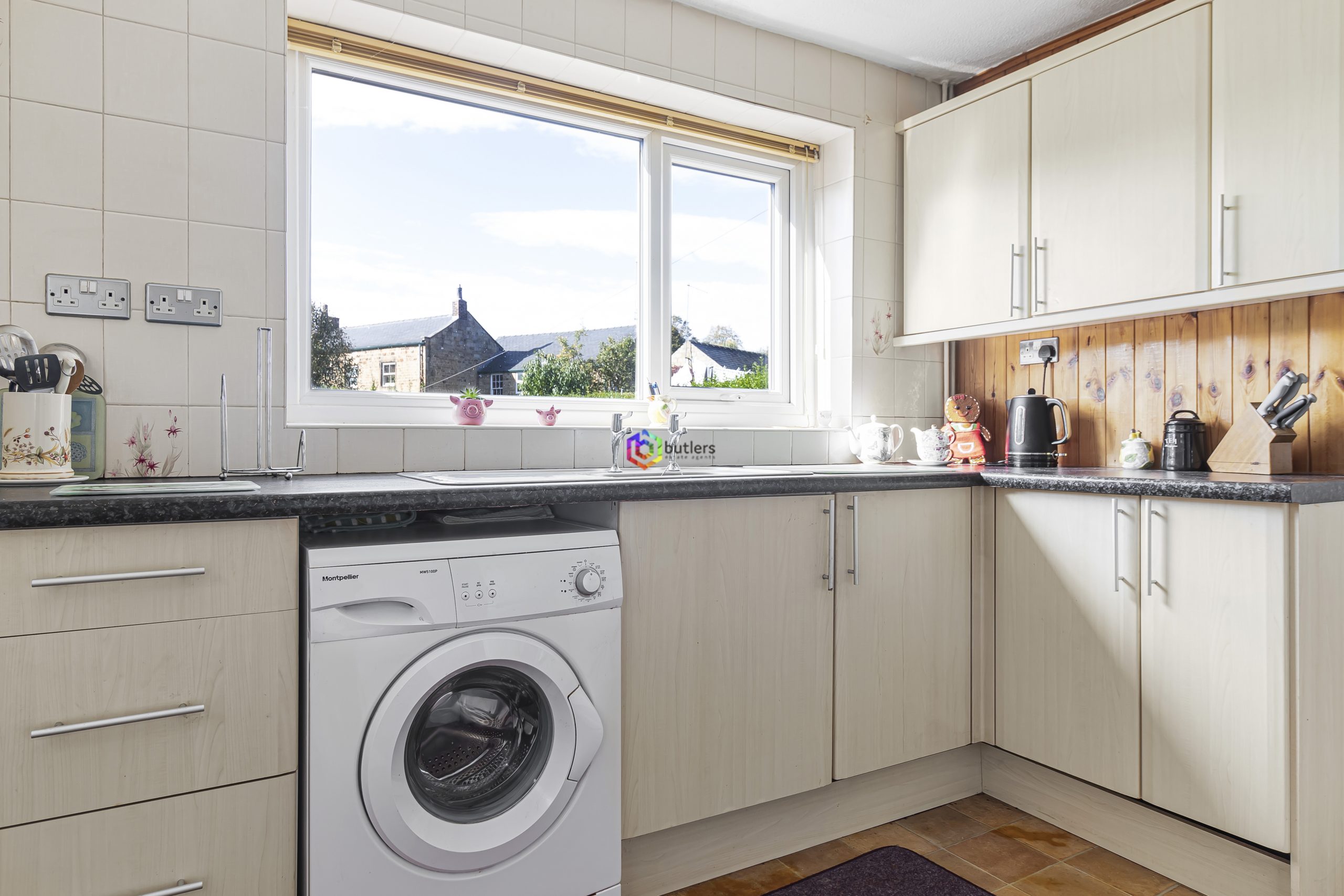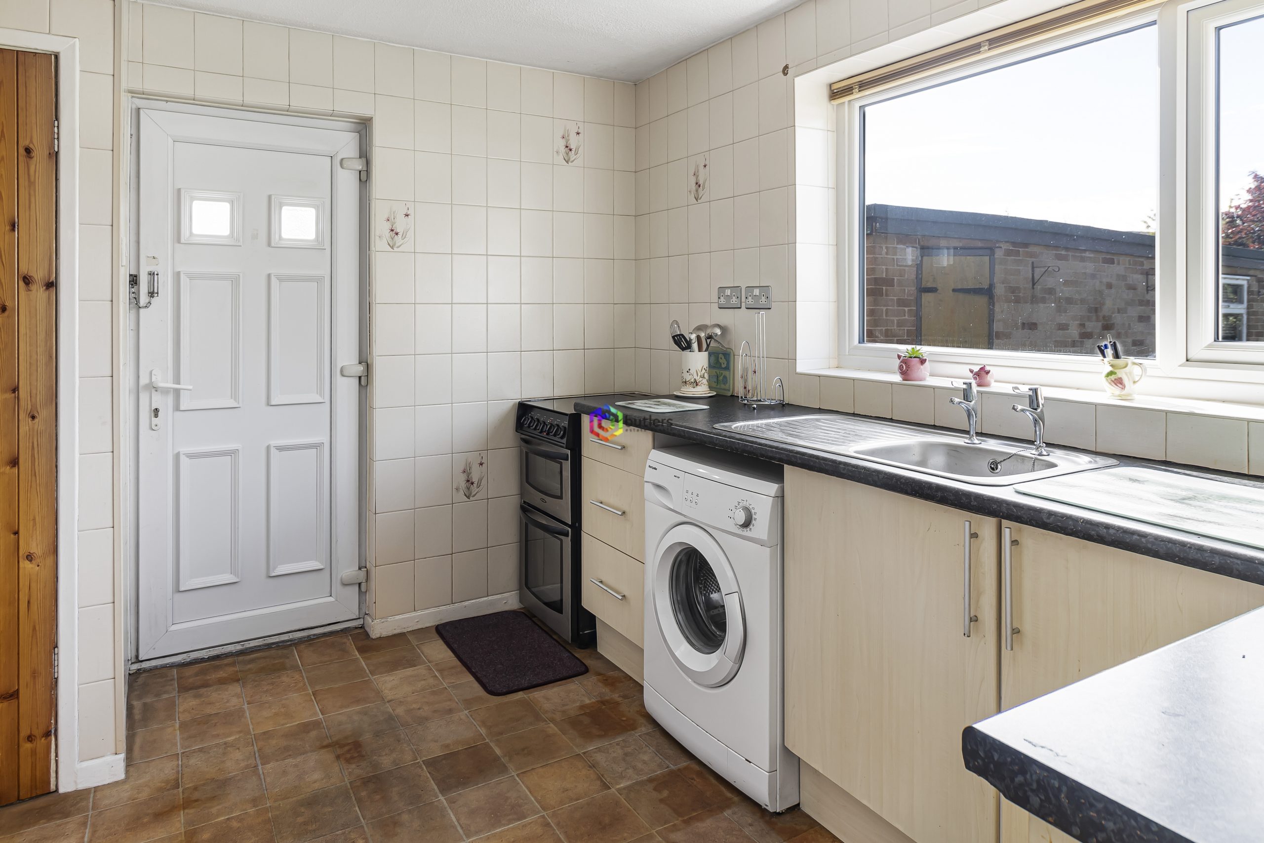 In need of modernisation, the kitchen currently has a slot in cooker, space for a washing machine and a sink beneath the window overlooking the rear garden.