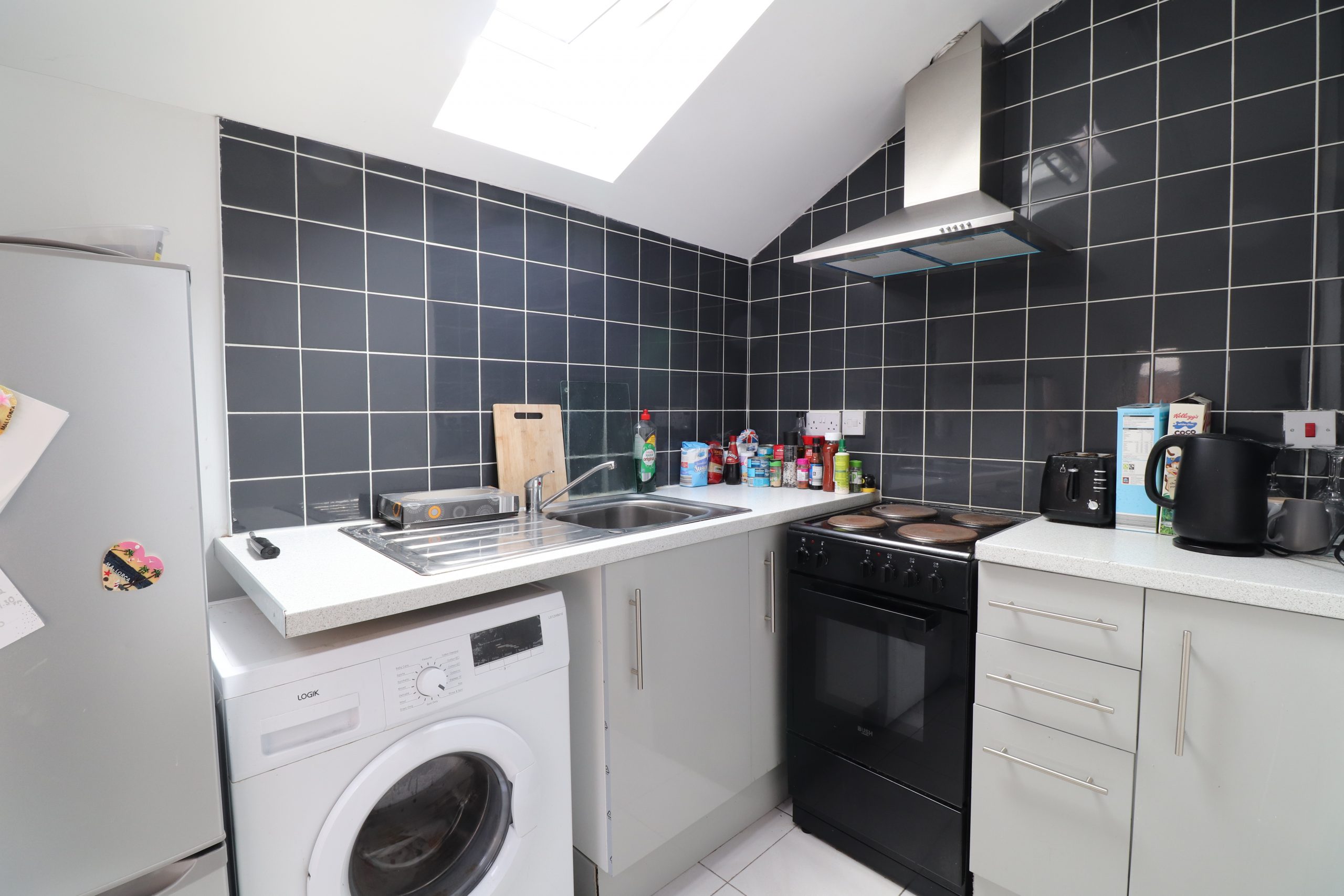 Kithen is at the end of the hall with a velux window, gloss grey units and a slot in cooker