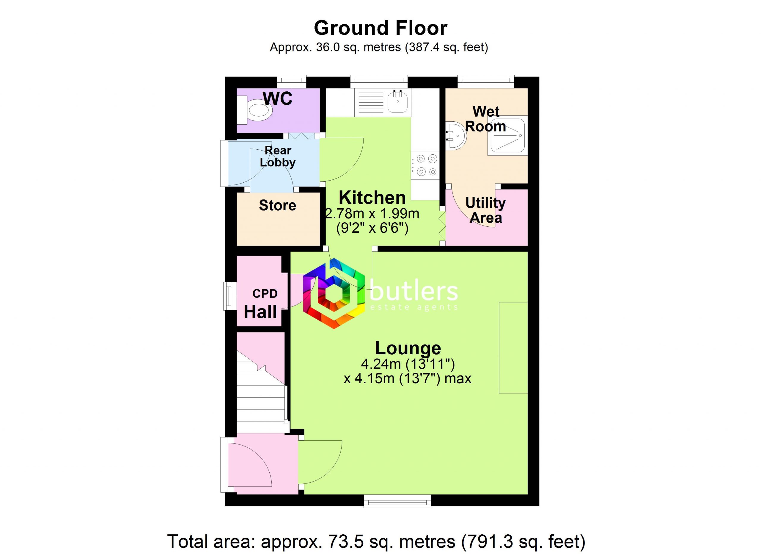 The front door leads into a square hall with a door to the lounge and stairs to the first floor.